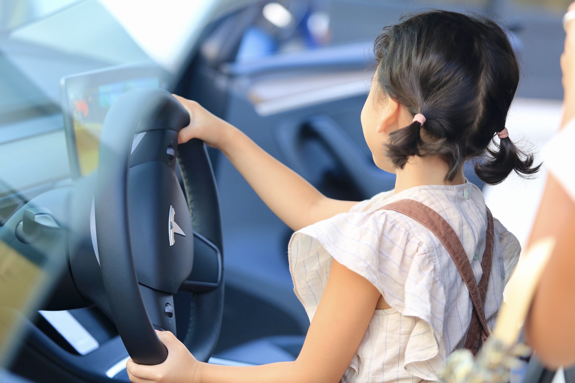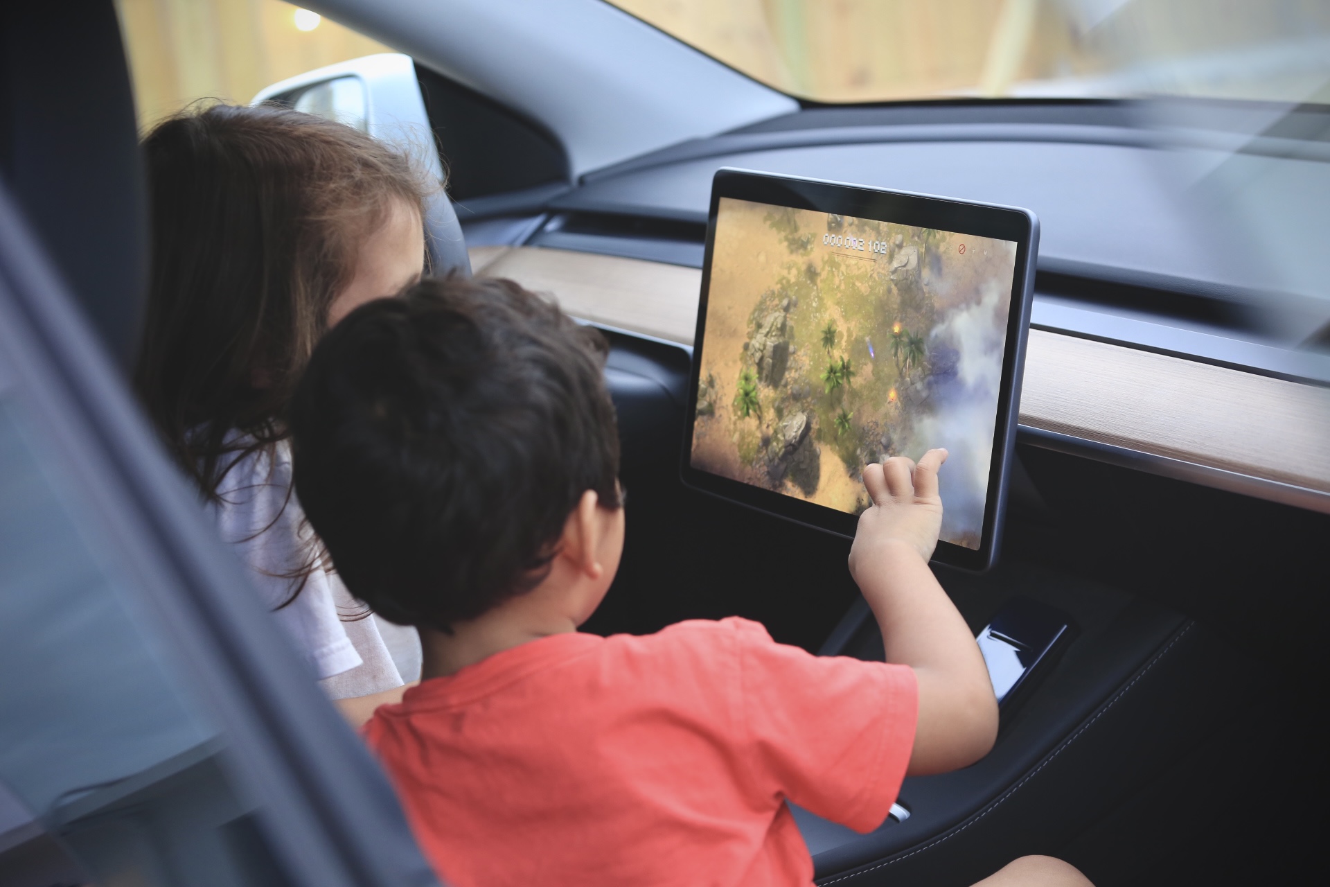 ▲ 另一頭,在車內的孩子,則使用 Tesla 特斯拉車內超大螢幕搭載電玩遊戲,讓家長在外社交時,小孩也能擁有如同置身家中的便利及樂趣體驗。