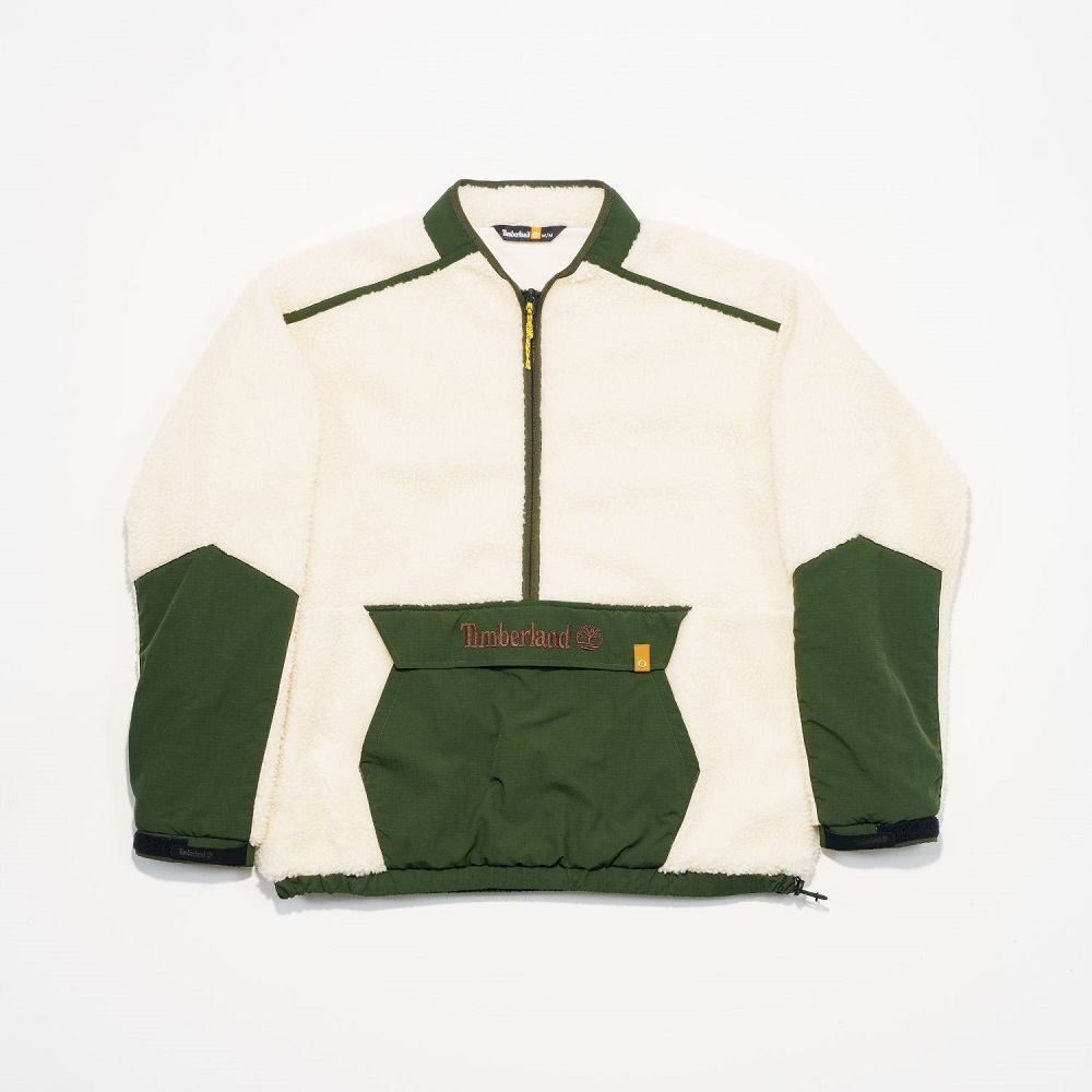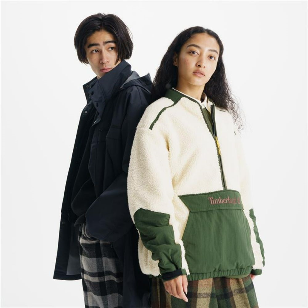 ▲Timberland TOKYO DESIGN COLLECTIVE中性米白色寬版半拉鍊套頭抓絨外套 NT$7,500