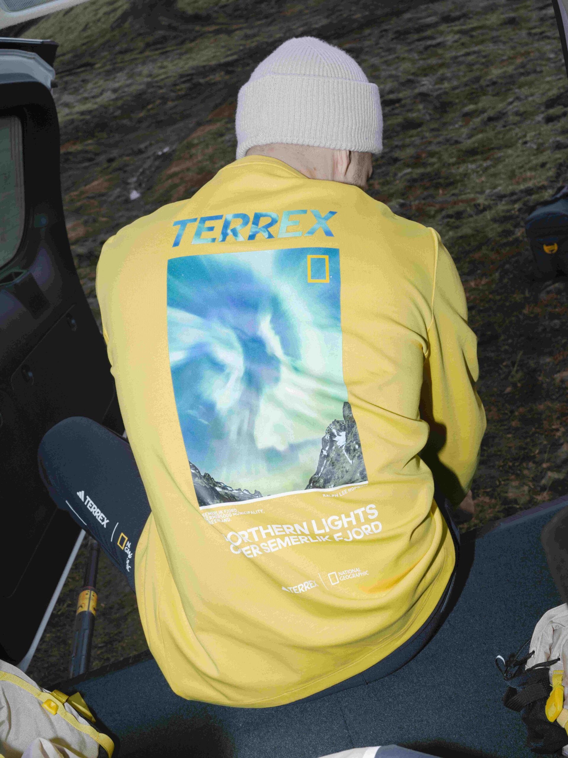 此外,聯名款的圓領長袖上衣選用高磅數針織和 AEROREADY 排汗透氣布料,它擁有 National Geographic 經典黃色搭配和黃框元素,後背處呈現出極光的風貌。寬版設計更打造出今年秋冬時尚的戶外風格!
