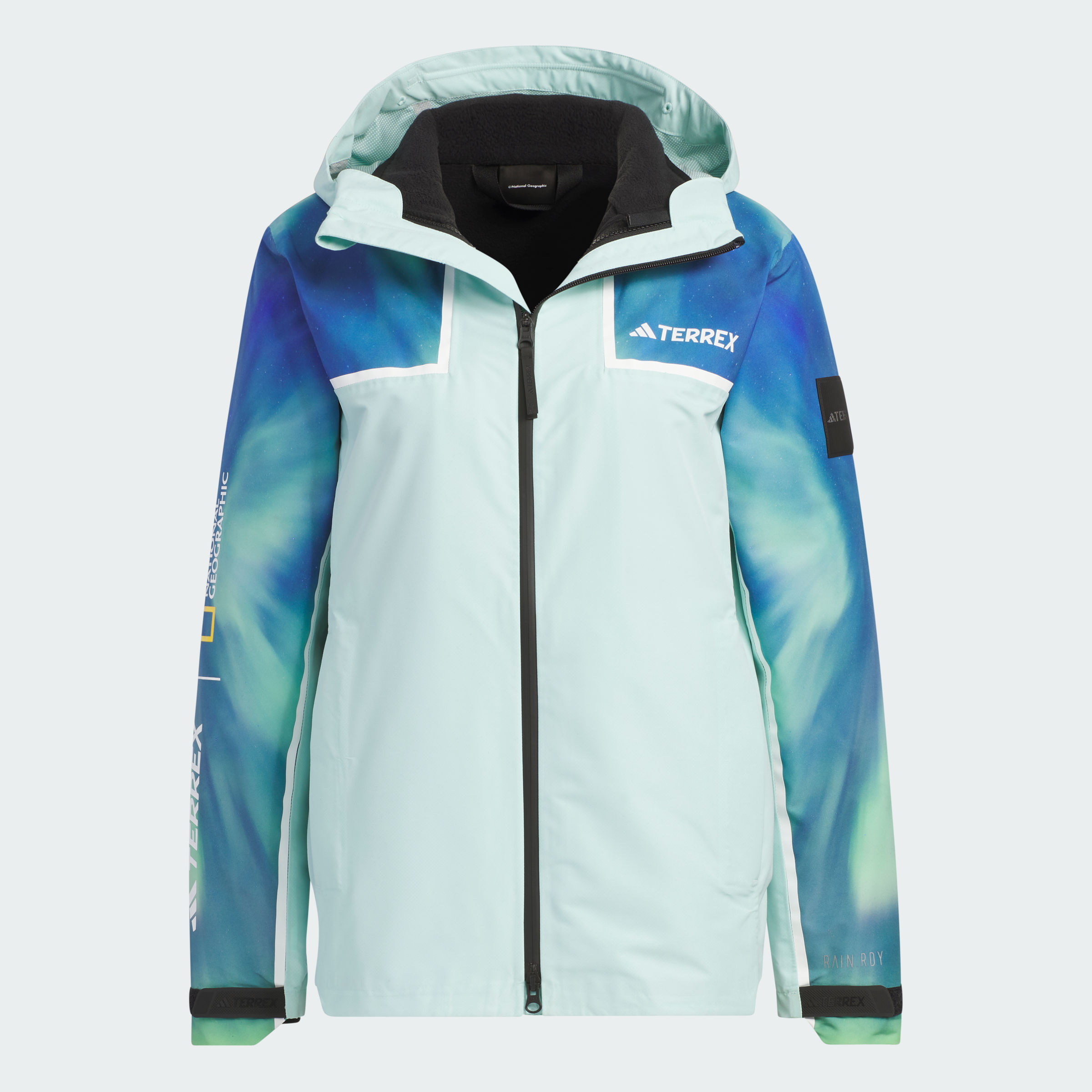此次 adidas TERREX x National Geographic 合作系列以極光照片為靈感,將極光的壯麗影像巧妙地融入服飾中,讓探索更能夠身臨其境,感受大自然之奧妙。三合一夾克以連帽兩件式的設計呈現,男女款夾克分別呈現從格陵蘭島上空拍攝的北極光照片,並在袖臂處銘刻雙方聯名的標誌,具視覺吸引力。