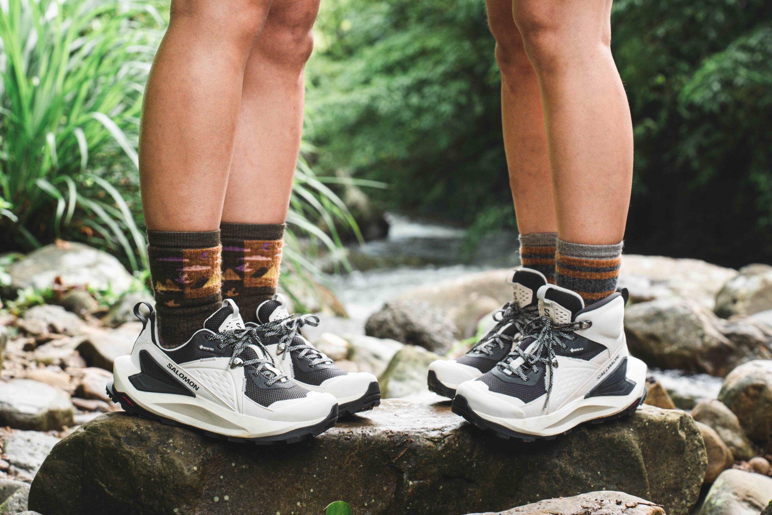 「你看今天這一雙外觀很漂亮,我平常就能穿去上班!」Lili 分享今日實著 Salomon ELIXIR Goretex 登山健行鞋的心得,Vivi 接著說:「而且像我們接著要去日本旅行與健行,這一雙鞋能陪我們探訪城市,也能陪我們上山!」