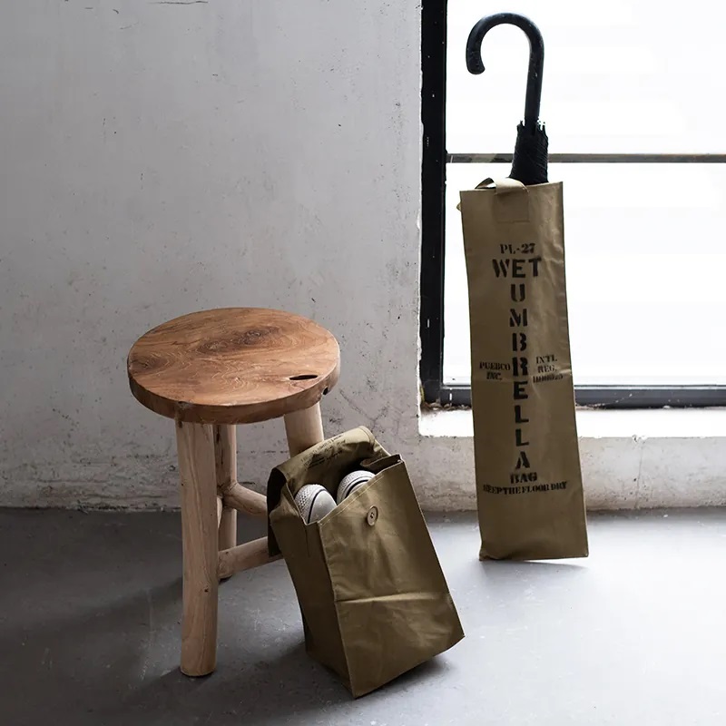 每次下大雨撐傘回到車上後,濕漉漉的傘總是不知道該如何置放,若是遇到車內物品較多的情況,可能還會因此而沾濕其他物品,PUEBCO 橡膠布傘袋以早期軍用雨衣改製,不僅有防水的功能,也有軍事風格的野外質感。回到家後,也可直接將傘袋帶下車放回家中曬乾,成為家中的裝飾品之一!