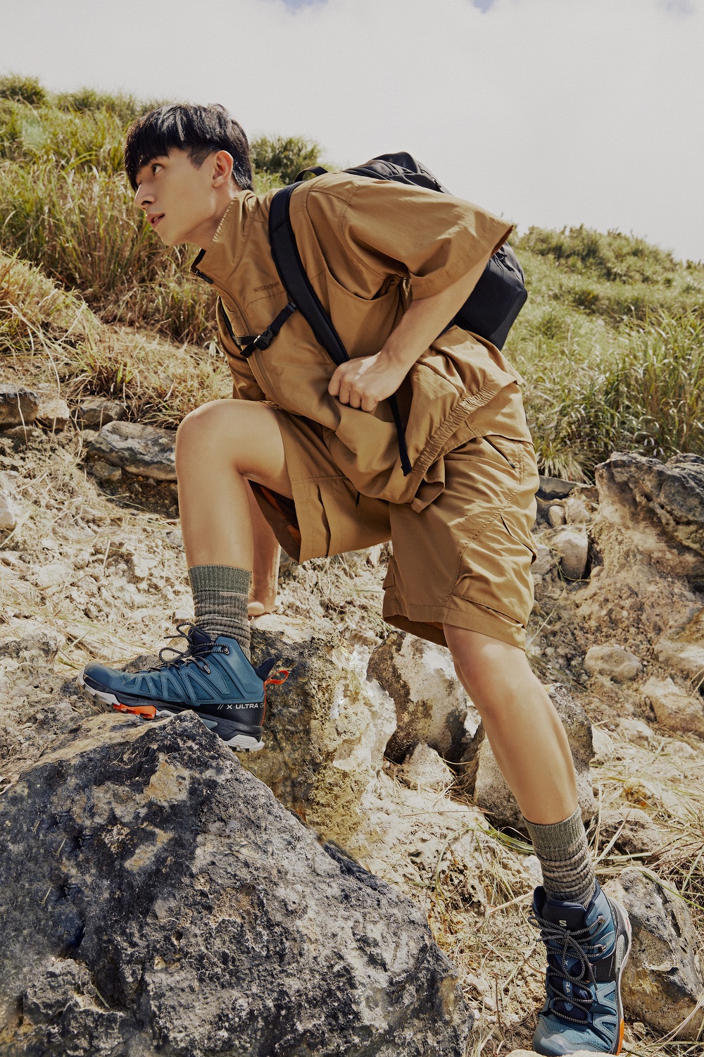 Salomon 擁有多樣機能性的登山鞋款,台灣是個多山多丘陵的環境,因此登山也成為近期的戶外運動熱門趨勢,山系冒險家林家佑當然也是爬山愛好者之一,平時進行戶外活動或日常也常運動穿著大地色系服飾,這次更將大地色系服飾搭配觀星藍配色的 X ULTRA 4 GTX,讓鞋款成為穿搭焦點而不突兀,呈現兼顧外型與機能的完美選擇。