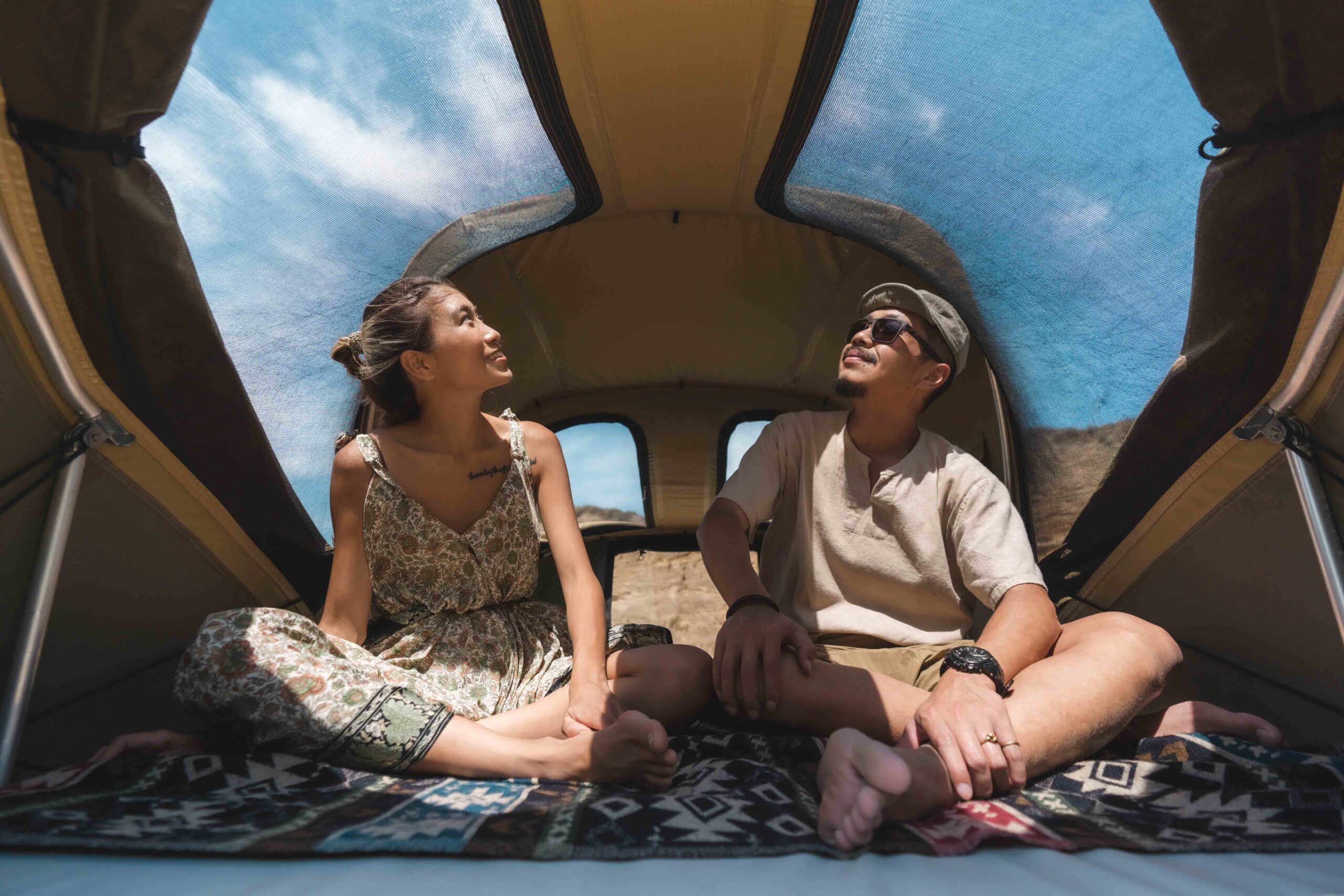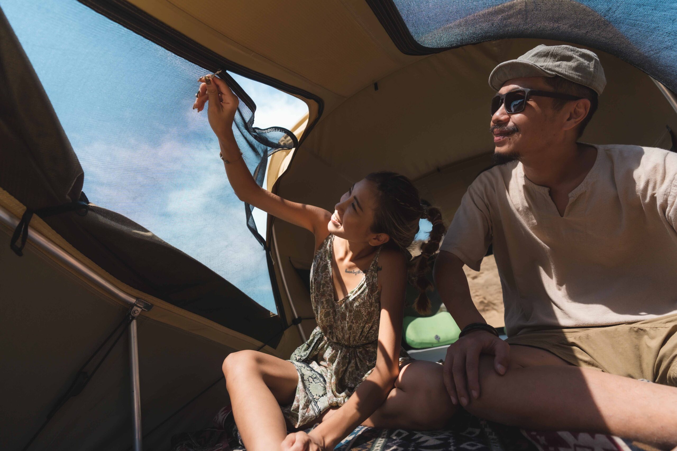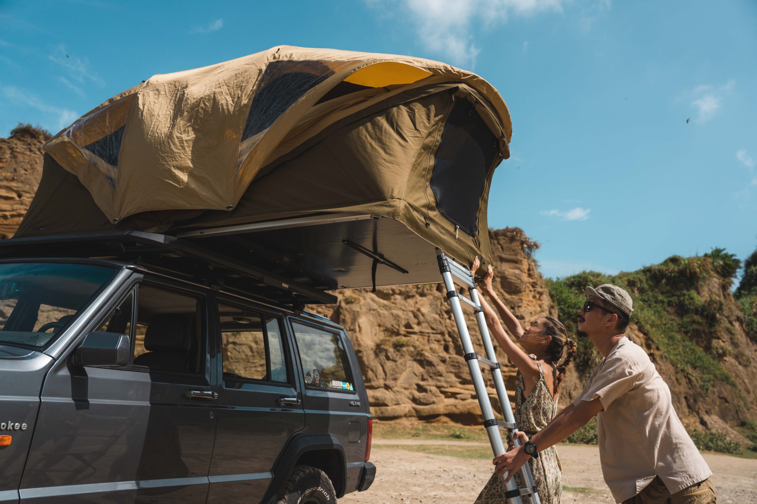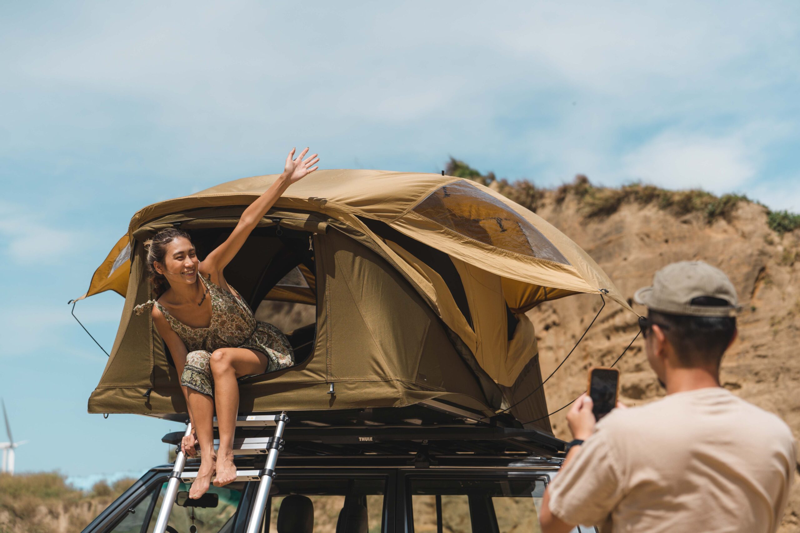 Thule Approach 車頂帳沙色款,更完全符合 Kris 和 Maggy 的露營及穿搭風格,大地色系能完美和諧地地融入戶外大自然,亮點但不搶眼的色調,就好比追求安全及冒險總和的品牌精神般,在自然探索中抓到巧妙的平衡,亦是對生活質感追求的展現。