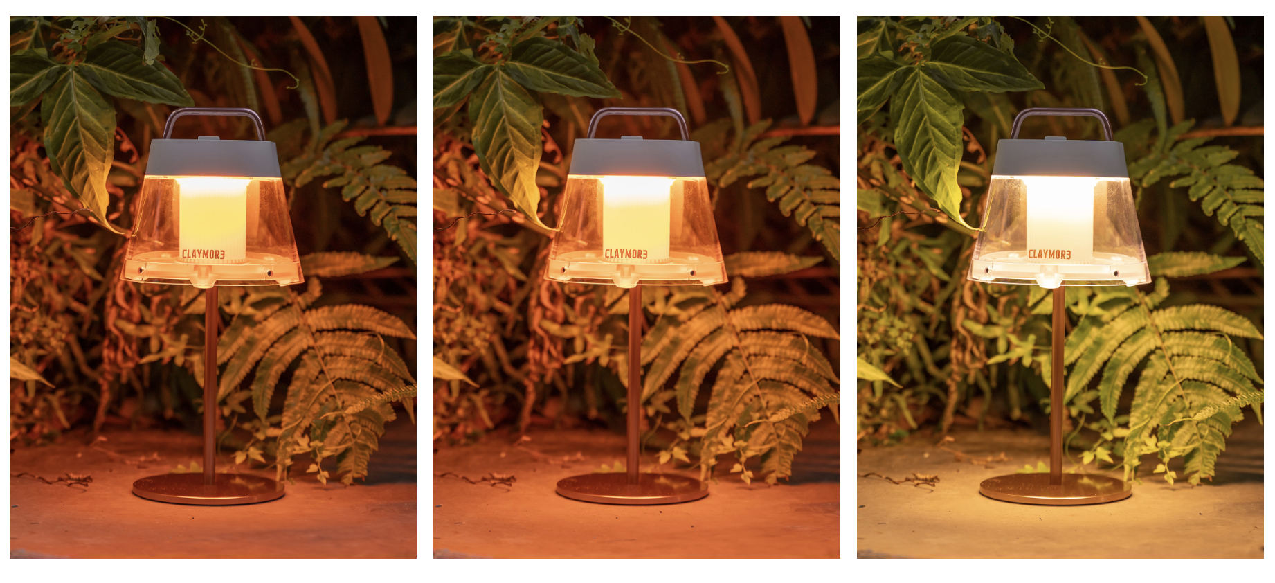 Claymore Athena 露營燈搭載三種不同的照明模式:微風、日落、日出,微風模式(色溫 1300k-1500k)打造如同篝火般的光影變化,有呼吸律動感的燈光,更顯自然生動,也輕鬆為露營美學質感加分;日落模式(色溫 1300k)則提供有如魔幻時刻般的橘紅暖光,日出模式(色溫 3000k)暖黃色光源,提供良好的照明效果,搭配座架使用可作為桌邊燈、閱讀燈,除戶外應用,更能在居家使用,展現其多元泛用性。