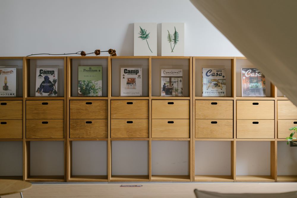 休息是為了⾛更長遠的路,若是能在樹陰下的光影搖曳中⼩憩那就更好了。天幕區設定給需要充電的⼯作者,在天幕與搖曳的紙蕨下擺放折疊⾏軍床及個⼈⼩帳,彷彿來到世外桃源,⼀旁更有 boven 雜誌圖書館特別為 camping office 活動精選刊物供空間使⽤者翻閱,提供⼯作者重置身⼼的隱蔽區域。