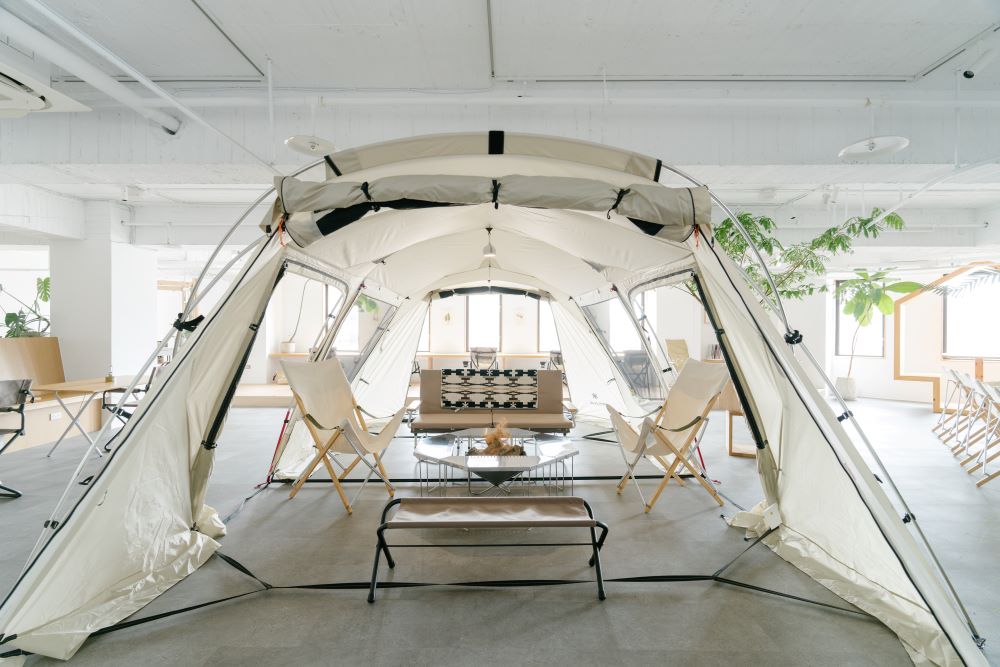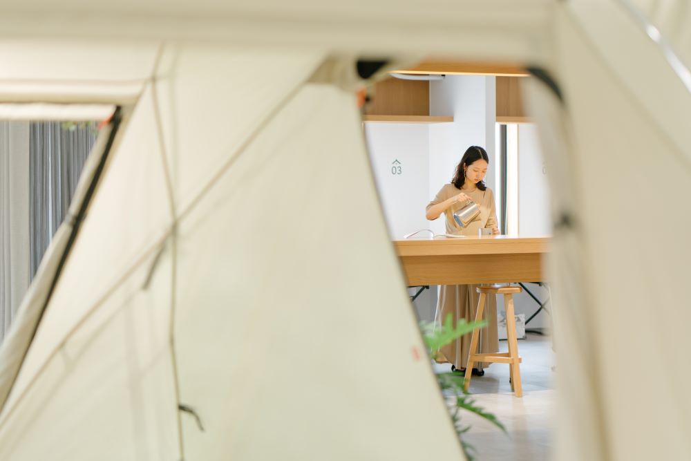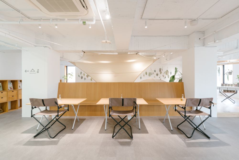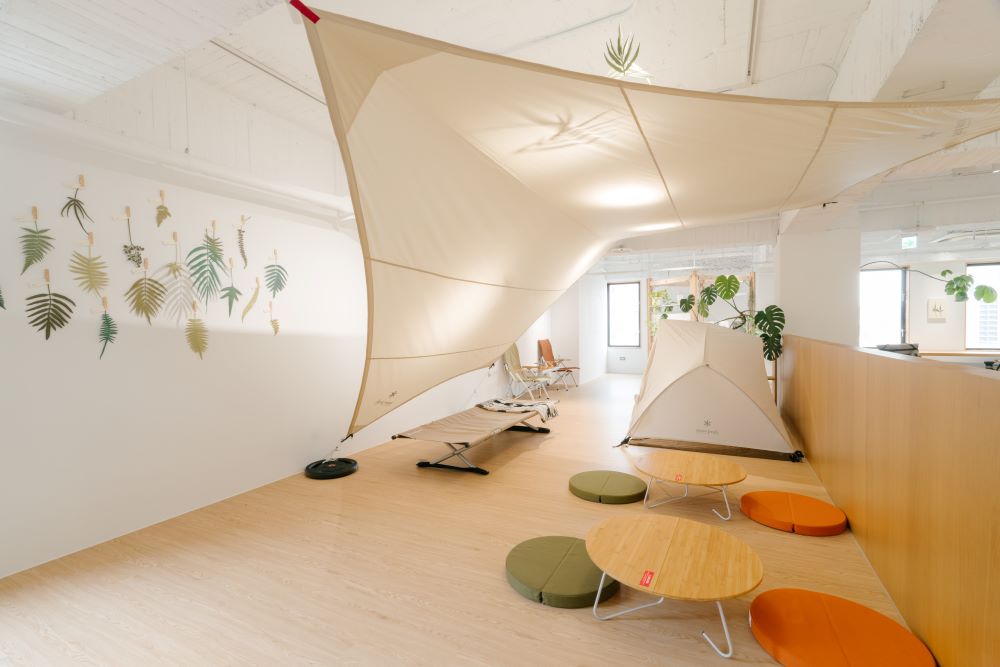 位於科技重鎮新⽵,森 SPACE 試圖在共享⼯作空間注入⽣活的元素,⼀如 Snow Peak Taiwan 提倡透過露營野遊來縮短⼈群間的距離,森 SPACE 將辦公場景從家轉換為⼾外,將⼤⾃然及露營的神奇魔⼒帶進室內辦公室即為本次的活動宗旨。森 SPACE 將共享⼯作空間視為⼀實驗場域,透過陳列配置、活動與服務,不斷向⼯作者拋出提問:「你⼼⽬中理想的辦公環境是什麼樣⼦︖」camping office的概念所訴說的遠不⽌是表⾯的露營風辦公室,⽽是經由場景的轉換,帶來⼯作感受的改變,⼩至負擔的減輕、⼼情的雀躍︔⼤至關係的改變、效率的向上、成效的彰顯,辦公環境的改變需要慢慢發酵,熟成的答案則需由空間使⽤者⼀點⼀滴回饋。