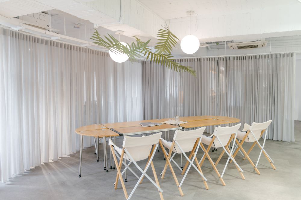 「露營⽤具的⾼度適合⼯作嗎︖」許多⼈⼼中都有這樣的疑問,因此森 SPACE 利⽤區域的劃分來展⽰不同情境的運⽤、⽽餐桌區主要以較具⾼度的⽵折桌及導演椅為主,適合喜歡在開闊的空間裡挺直腰板專注的⼯作者,因為桌椅的可變動性佳,也很適舉辦讀書會、⼩型研討會等活動。