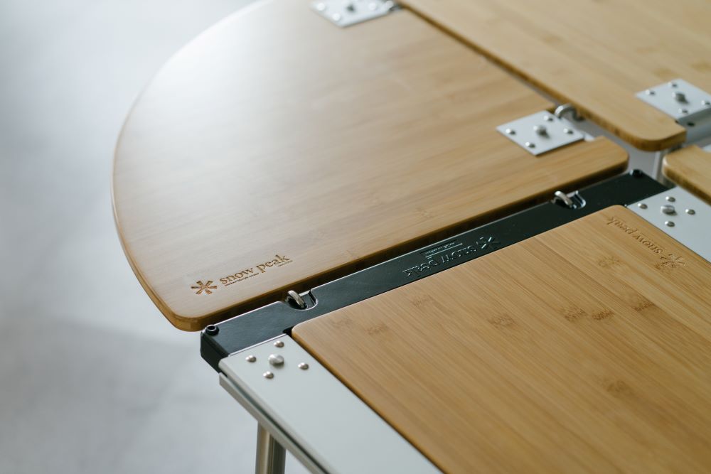 使⽤ Snow Peak Taiwan 最為廣泛應⽤的產品之⼀:可以相互連接成不同排列的「IGT系列」。森 SPACE 屏棄塑料及笨重,留下⽵製的輕巧,將原先設定在⼾外運⽤的餐櫥桌⾯組合成⼤長桌,天然⽵材所產⽣的⾊澤層次堆疊出森 SPACE 的空間氣質。當然,未來空間使⽤者的創意也將為 IGT 區呈現更多樣的⾯貌。