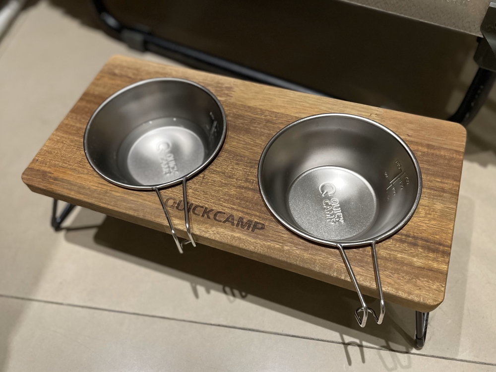 帶寵物露營除了要記得帶碗,準備一個碗架會更便利。兩人推薦的是日本品牌 Quick Camp 所推出的可折疊碗架,外型就有如一張小小的露營摺疊桌,差別在於桌面可放置兩個碗,一個可放飼料,一個可放水,讓毛小孩露營也能有濃濃 outdoor 感!