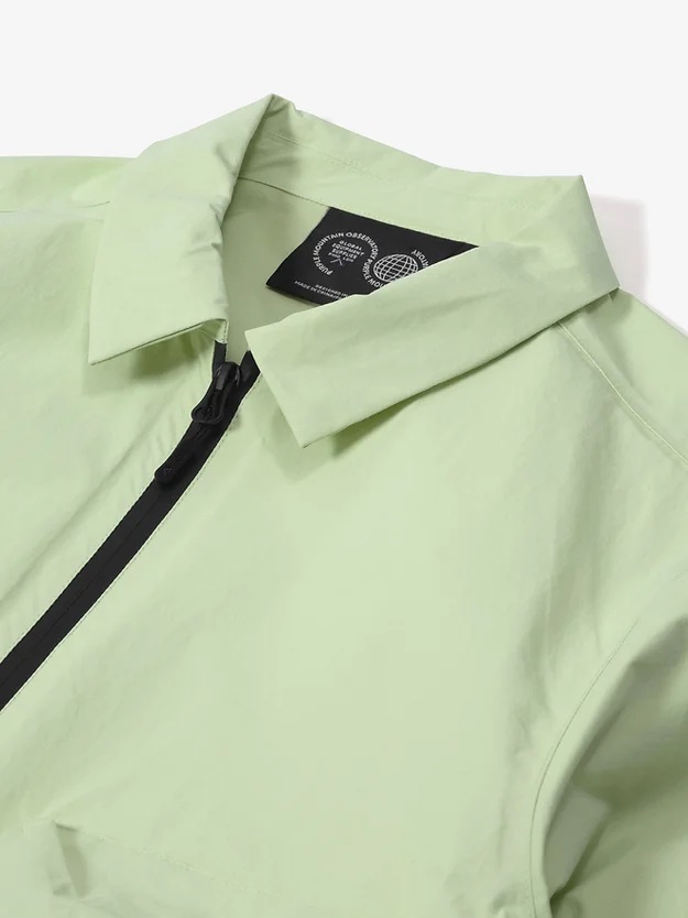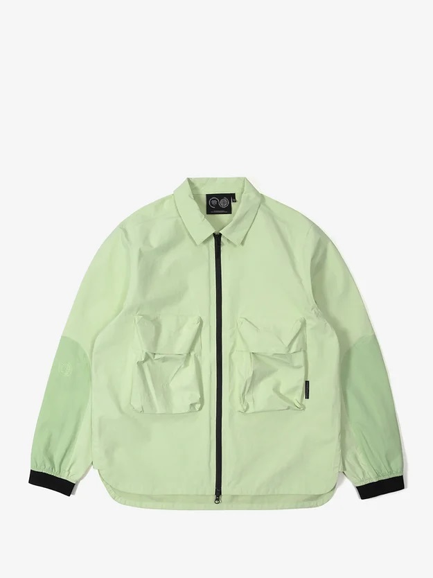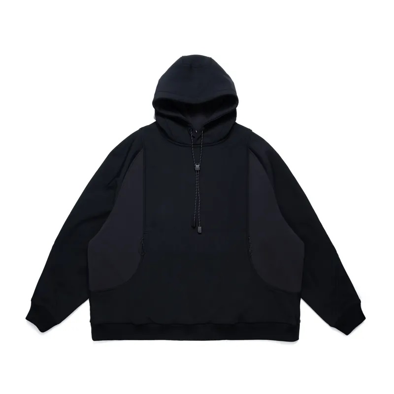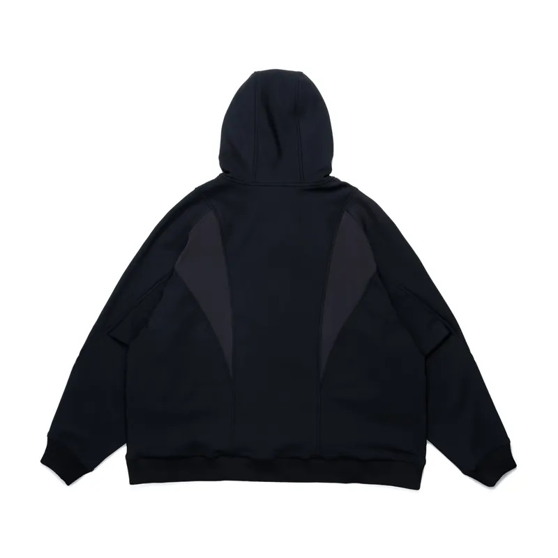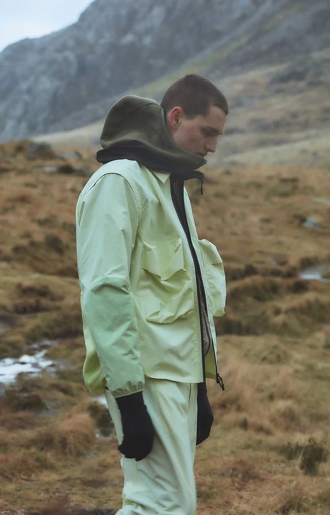 隱晦的北字剪裁,以篆書直入平出的筆法線條切接,兩側斜邊與背後肩頰骨處使用異種布料拼接。【點】:使用反光拉繩隱形拉鍊,帶出單品中機能的點綴;【直】:大力馬繩使用WJ調節束扣;【弧】:拉格蘭袖型的下彎袖攏線與對稱隱形拉鍊口袋。材質選用 4-way stretch四面彈內刷毛防潑水面料,外層滑順,內層刷毛處理的觸感,在防風、保暖同時兼具親膚性。