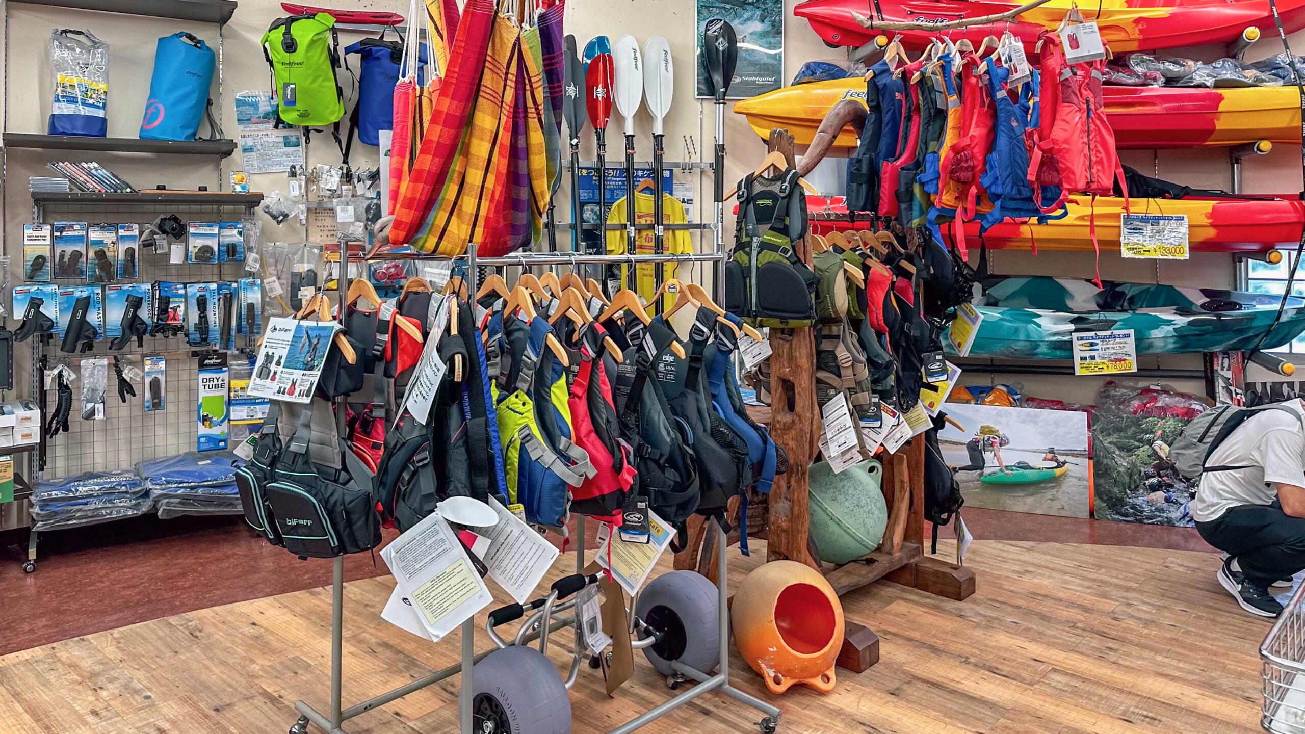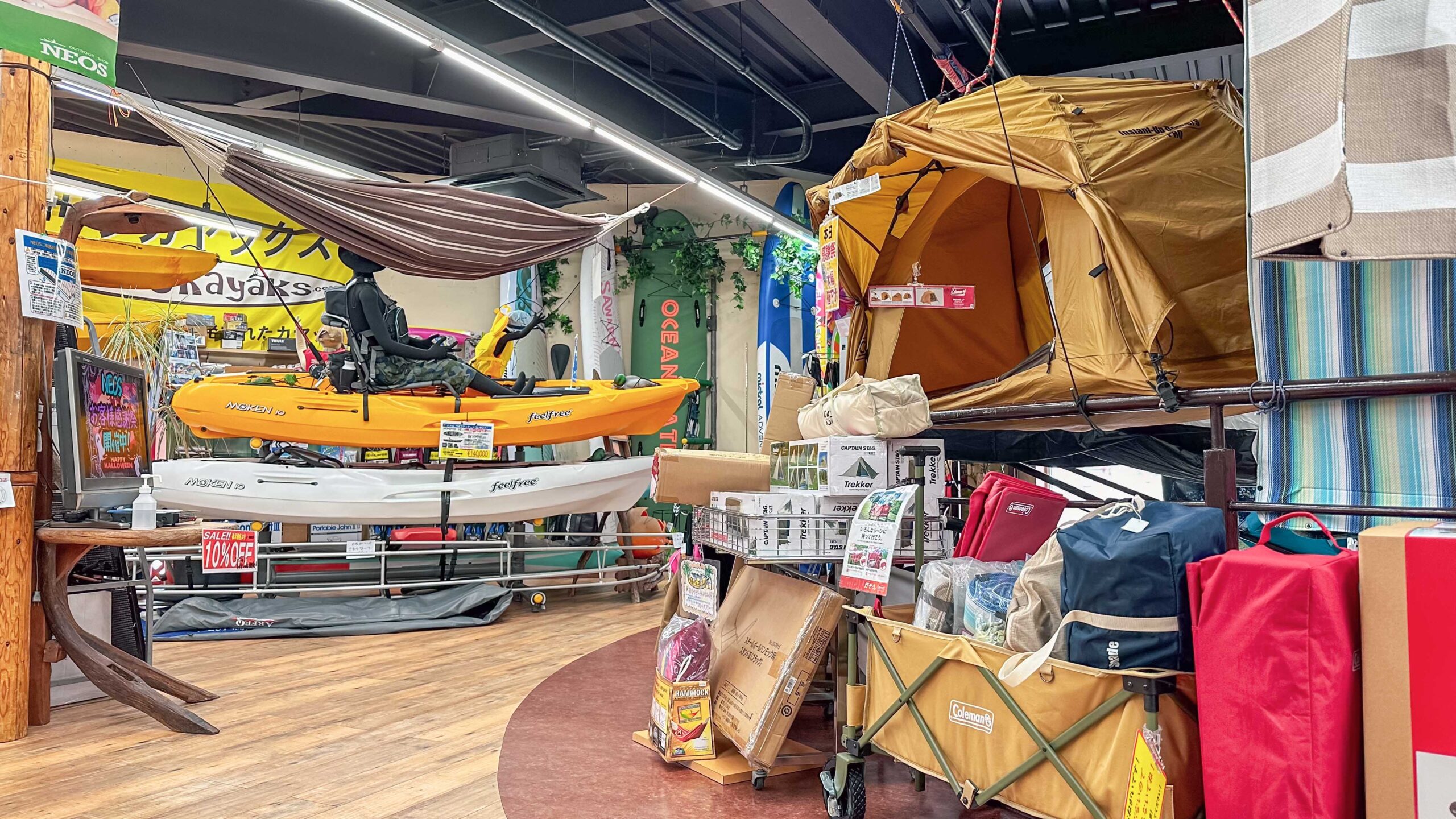 創立於 2002 年的 NEOS,座落於那霸東北方的浦添,從那霸空港沿著海岸線前往,約需 30 分鐘車程,Nature、Earth、Ocean、Space,其命名從自然、地球、海洋,到太空,可見其品牌定位之多元,而從建築外觀就能清楚看見他們販售品項從獨木舟、露營、健行、旅行、單車、攀岩等戶外活動應有盡有,一樓主要展售服飾、鞋履及自行車,二樓則是露營及水上活動相關商品,品牌從 Feelfree、biFarr、The North Face、Columbia、Chums、Montbell 等,從美國到日本的戶外品牌在這裡都找得到,算是在沖繩少數能一站購足 From Head To Toe 的戶外用品店。