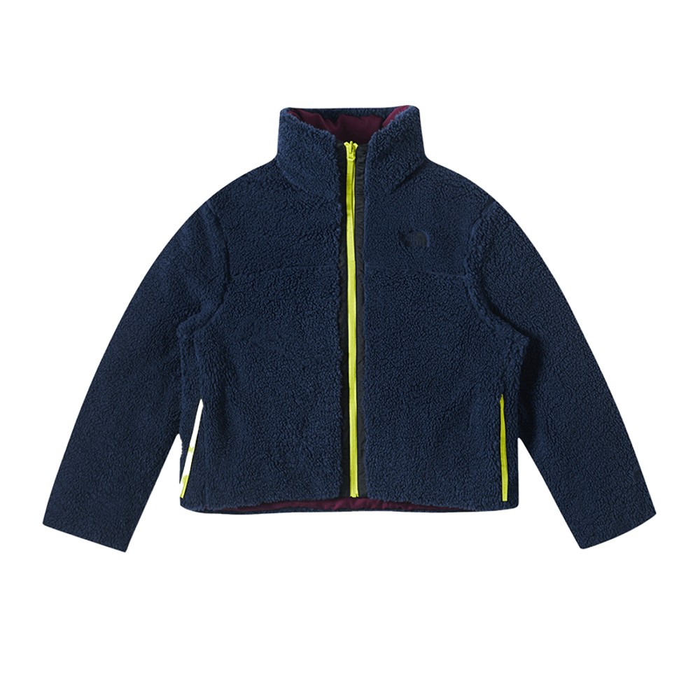 女生的羊羔絨外套可正反兩穿,正面立體感羊羔絨搭配反面絨毛魚骨紋路,一件外套兩面自由翻轉,適配不同場域;內搭短版 Polo 衫款長袖T恤,上半身更挺闊有型,加上立體休閒剪裁的拼接百褶長裙相互呼應,冬季女孩也能穿出既酷又甜的新風格。