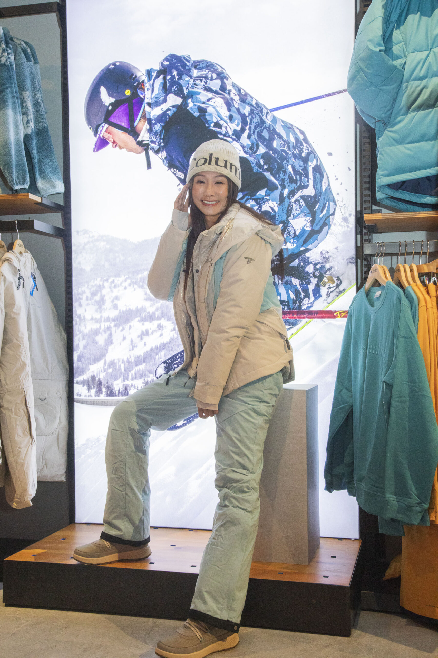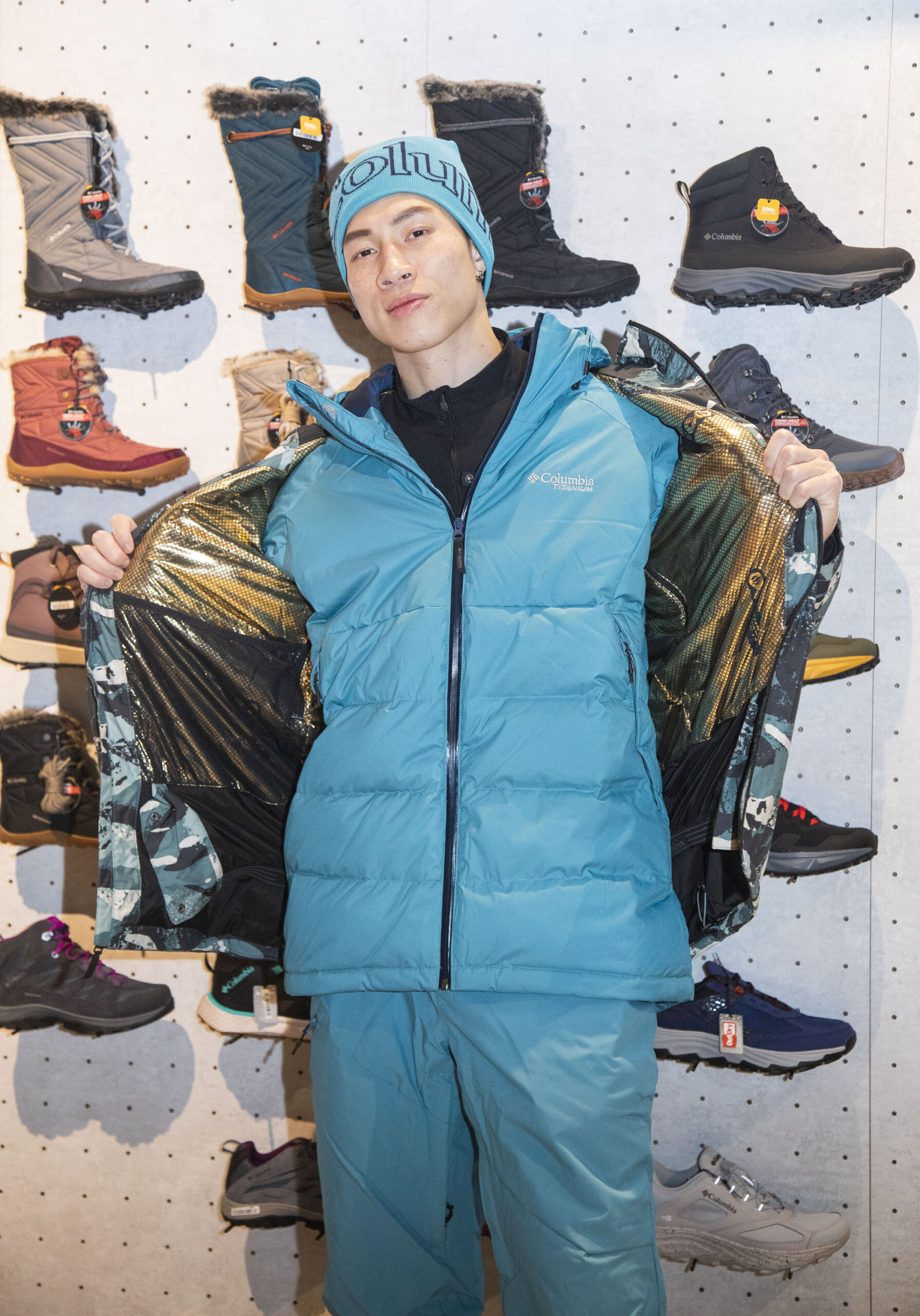 ▲ 現場更特別邀請到熱愛旅遊的YouTuber 丁小羽與運動達人熠凱示範穿搭如何穿出時尚又保暖的滑雪保暖裝備,在滑雪場上維持長時間保暖透氣又能舒適運動的滑雪裝備!