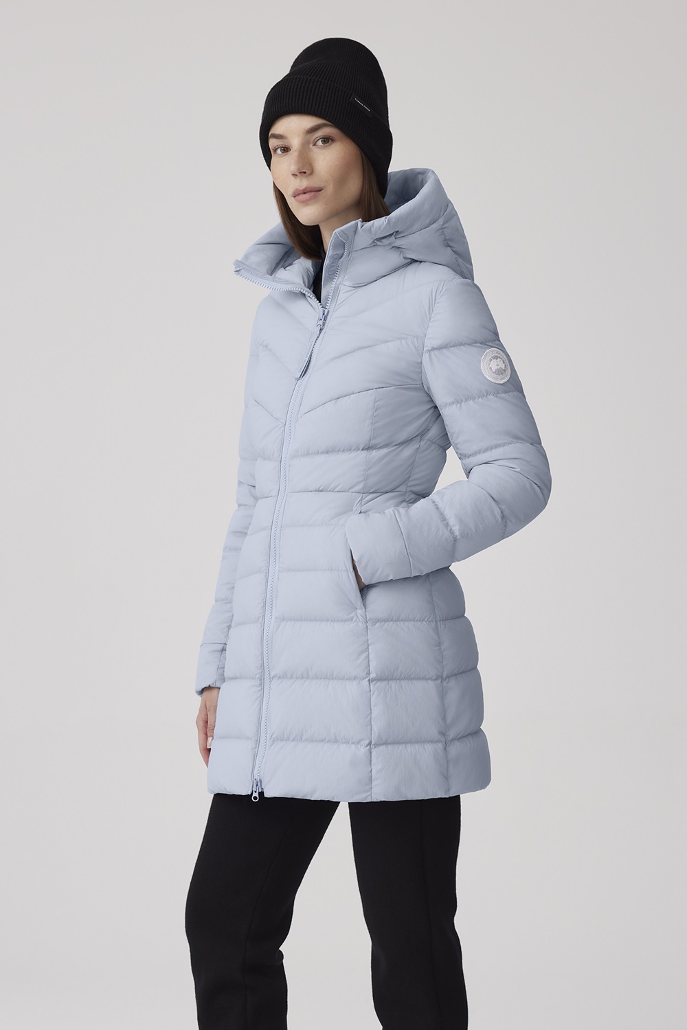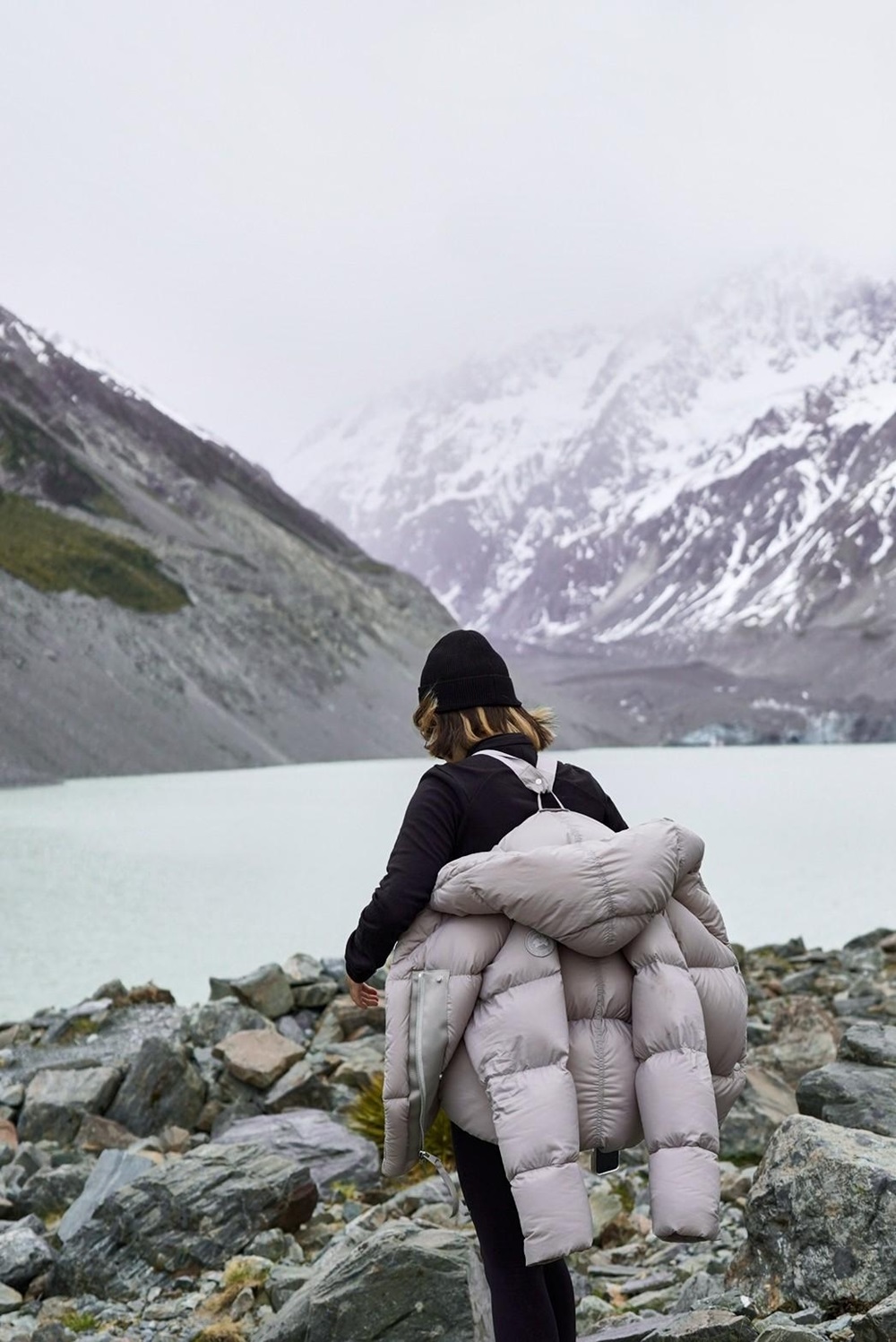 台灣地區的潮濕多雨的氣候型態,以及假日投身山林的登山、露營等生活型態,在挑選機能羽絨服飾上,建議以輕量、防潑水和抗風的機能面料為首選,像是 Canada Goose 首次推出的 Clair 系列,是專為女性設計,在曲線上線條更為迷人,此系列採用富有彈性的 Aira 面料,輕盈、行動自如,加上啞光質感,整體散發出低調精緻的風格。