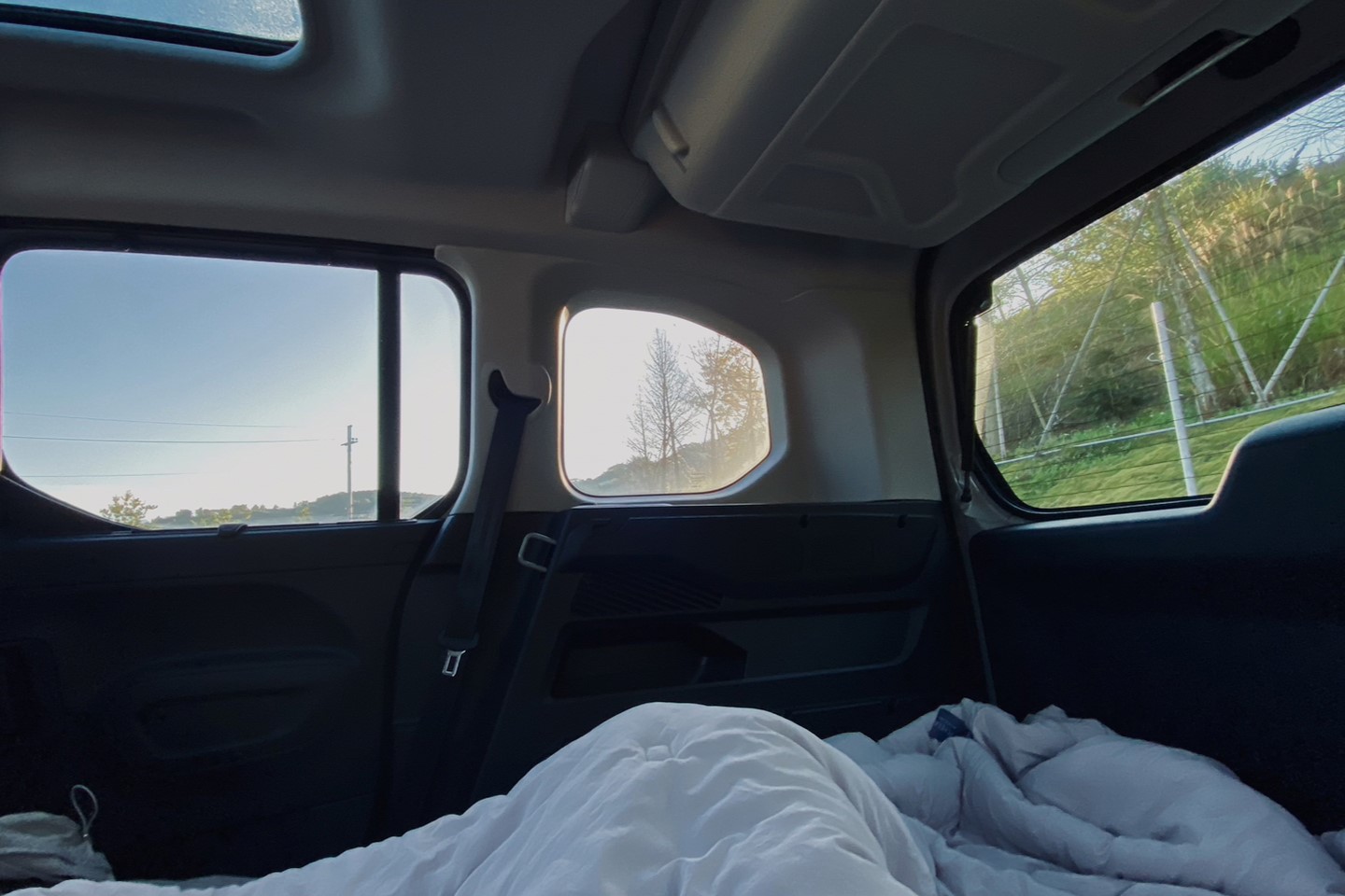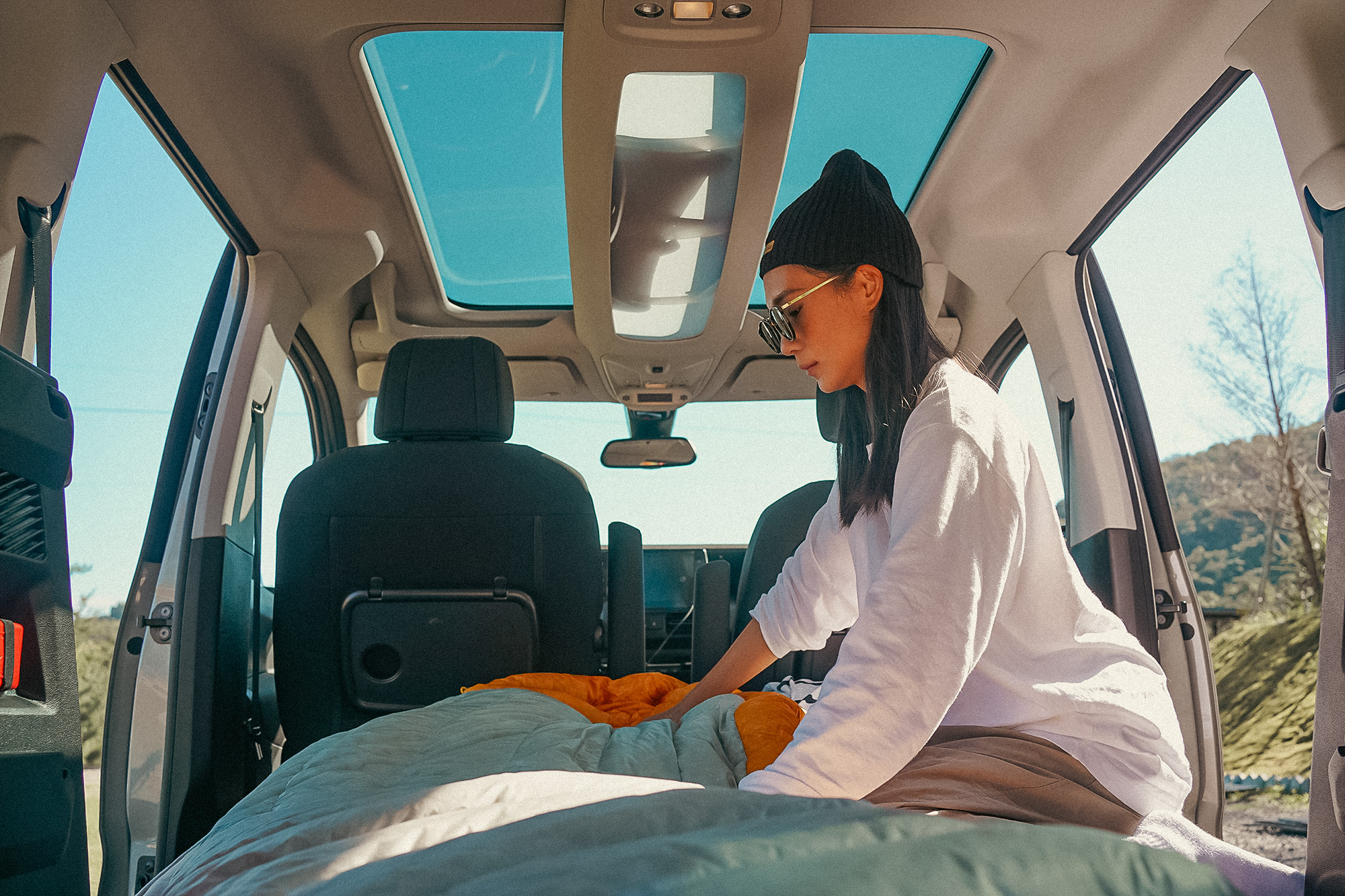 在車室內,一抬頭就有全景式玻璃車頂,帶來更開闊的視野,幸運如我們,清澈的夜空,一躺下就能看見星星,整晚有星星相伴入睡,一早睜開眼迎來的藍天,也讓車內更溫暖了一些,賴床了好一陣子才想起身。