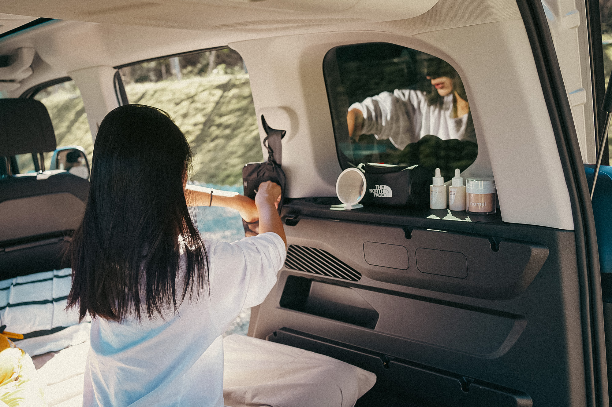 ▲後車箱位置有一處檯面,索性直接當作化妝台,超方便!