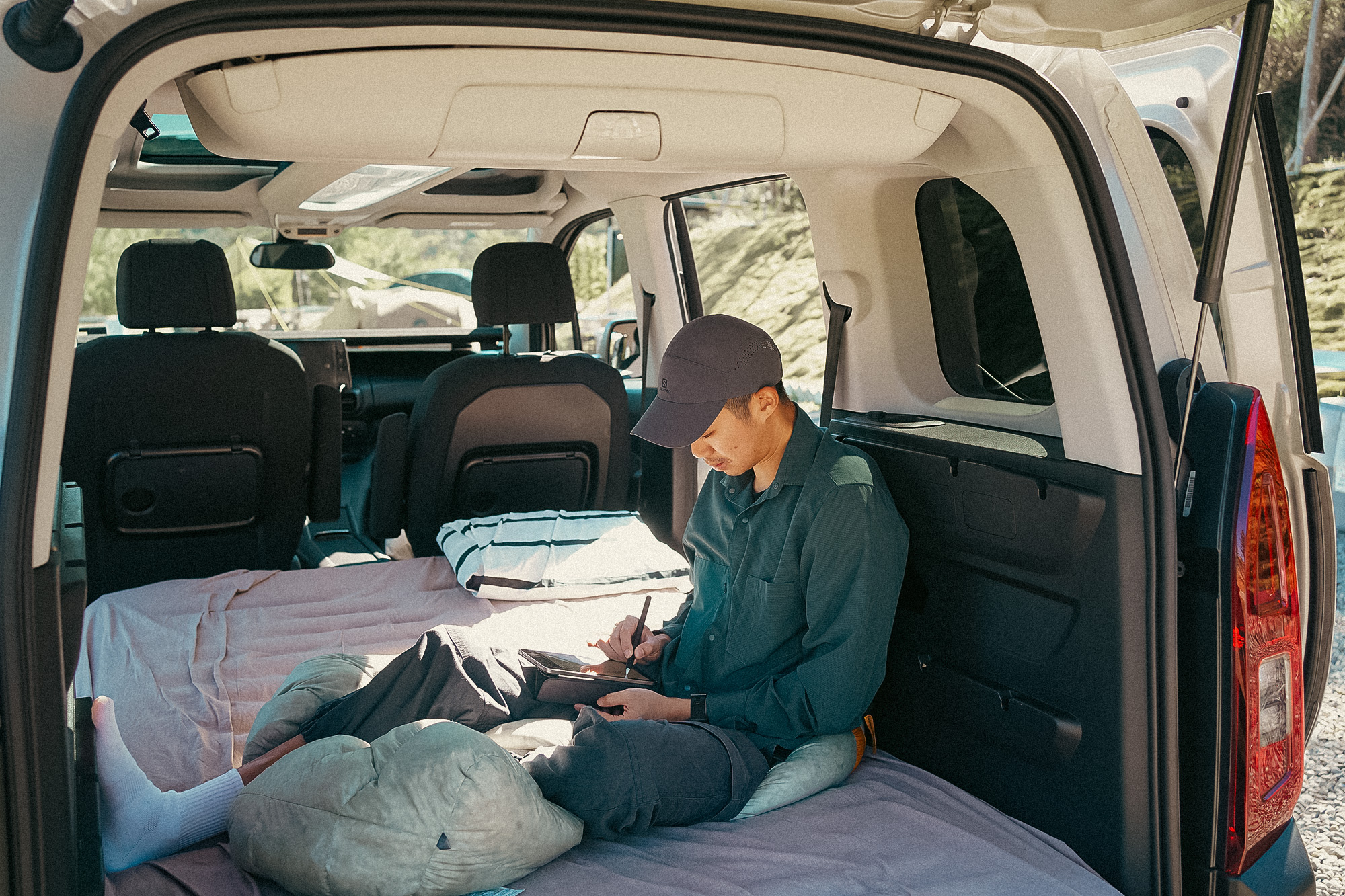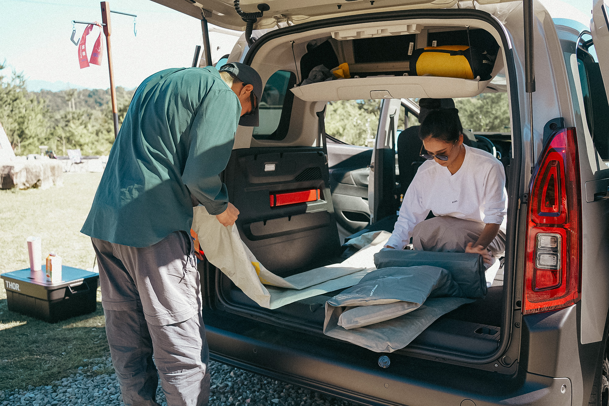 這一次參加黑熊部落,派出我們的上山下海好夥伴 Berlingo 作為這次露營的家,車子為短軸版本(車長4,400mm),車室內仍有長達2,700mm 的空間,因此後置物容積自然也不容小覷,第二排傾倒座椅,增加大大的空間,即便是兩人睡也很有足夠的空間。