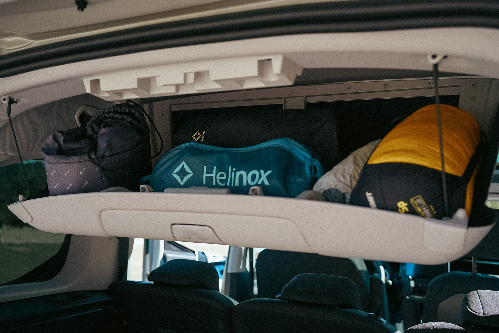 置頂式收納空間,可以放置車露常使用到的寢具系統、椅子等等,如此以來減少收納箱的使用,或是可以騰出更多空間,放置其他物品。(椅子絕對是音樂祭的超級必需品!甚麼都沒帶都絕對不能忘記帶椅子阿!)