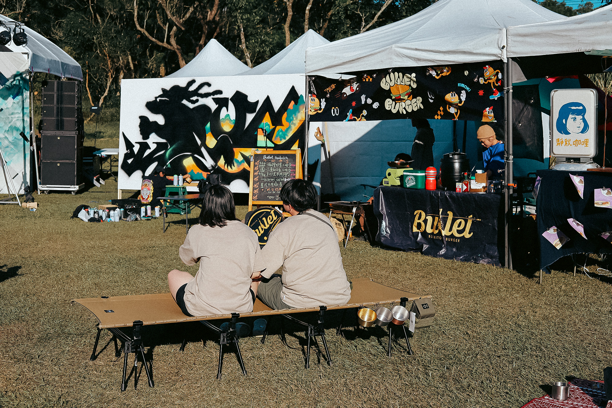 辦理完手續、停好車,真正入園時已是傍晚時分,好在已有攤商進駐,飢腸轆轆的我們,不用急忙著搭帳、煮飯,就有現成的美食可以享用。