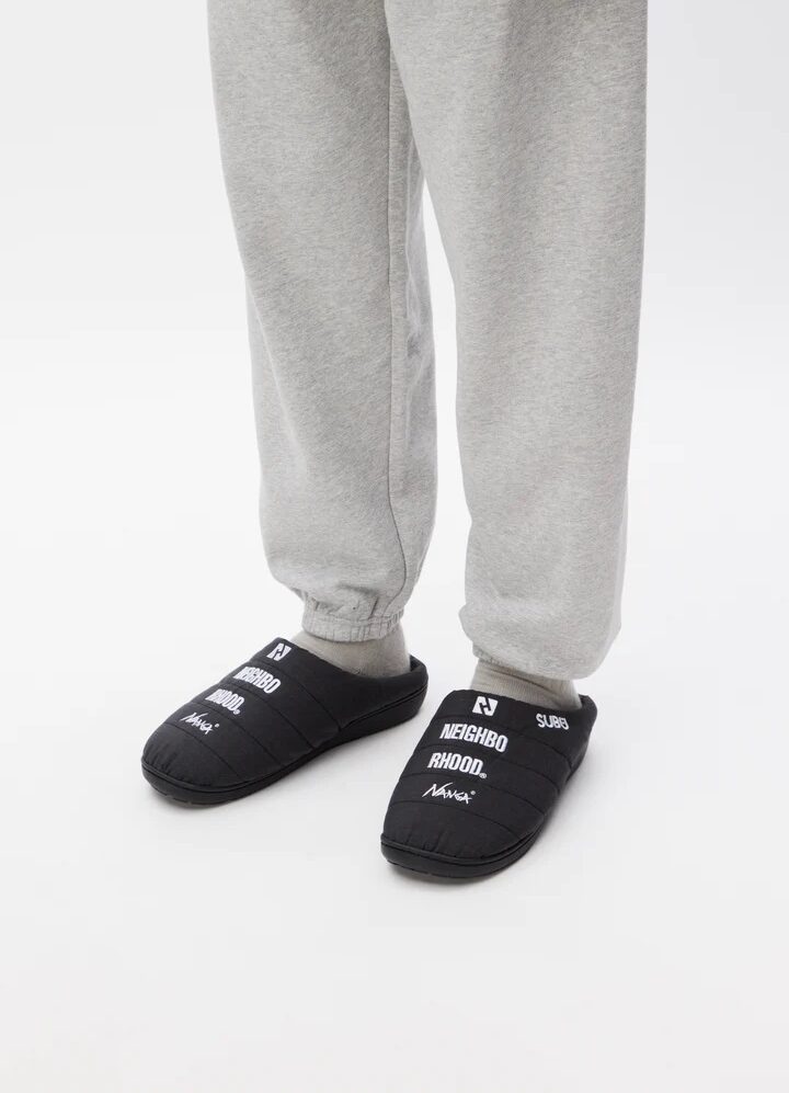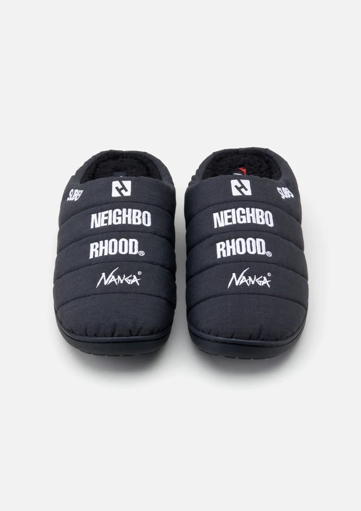鞋面採用 Nanga 的難燃材質,並採用三方品牌名字刺繡,鞋墊左右腳分別有 Nanga 與 Neighborhood 的 Logo 布標。
