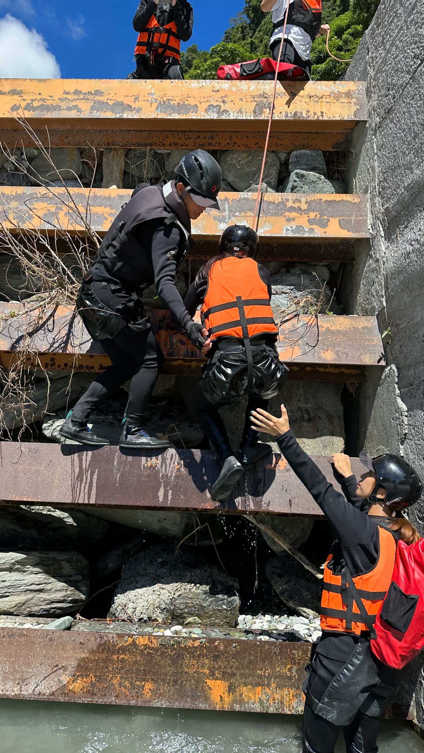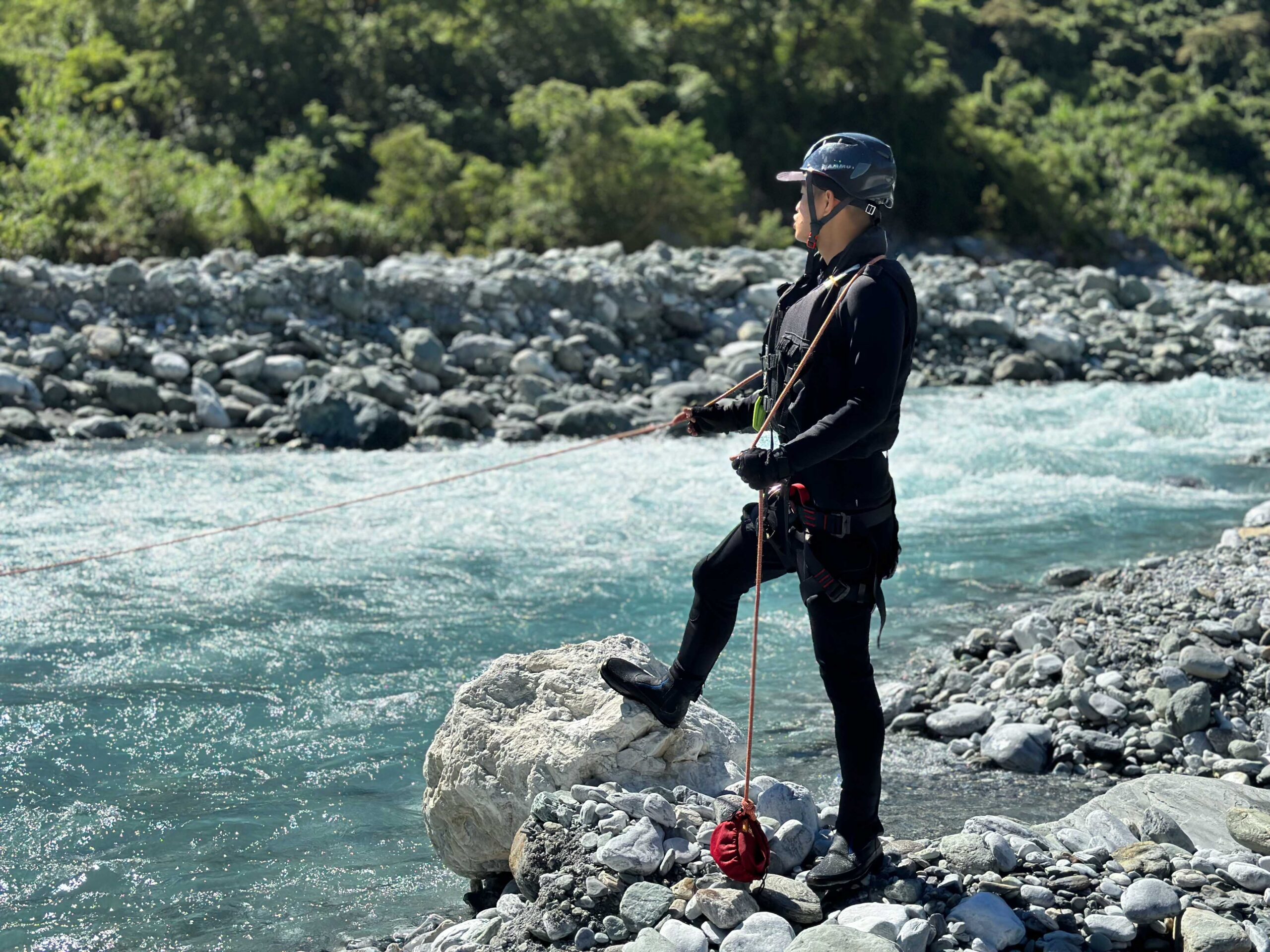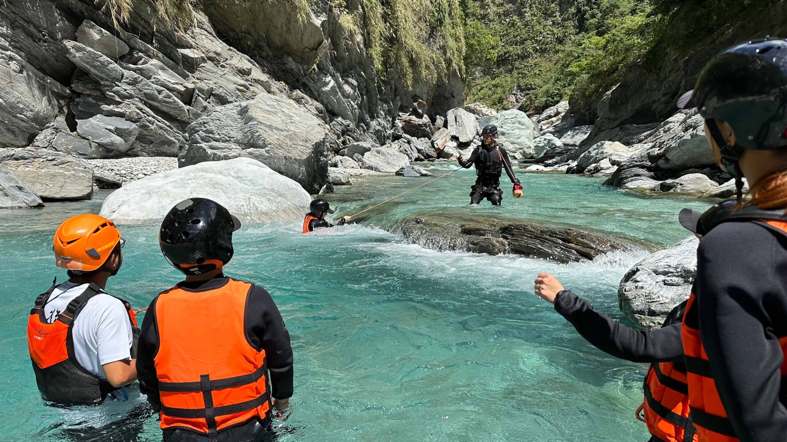 ▲ 阿賢教練讓團員體驗逆流攀繩而上;並教導正確使用救生衣的方式