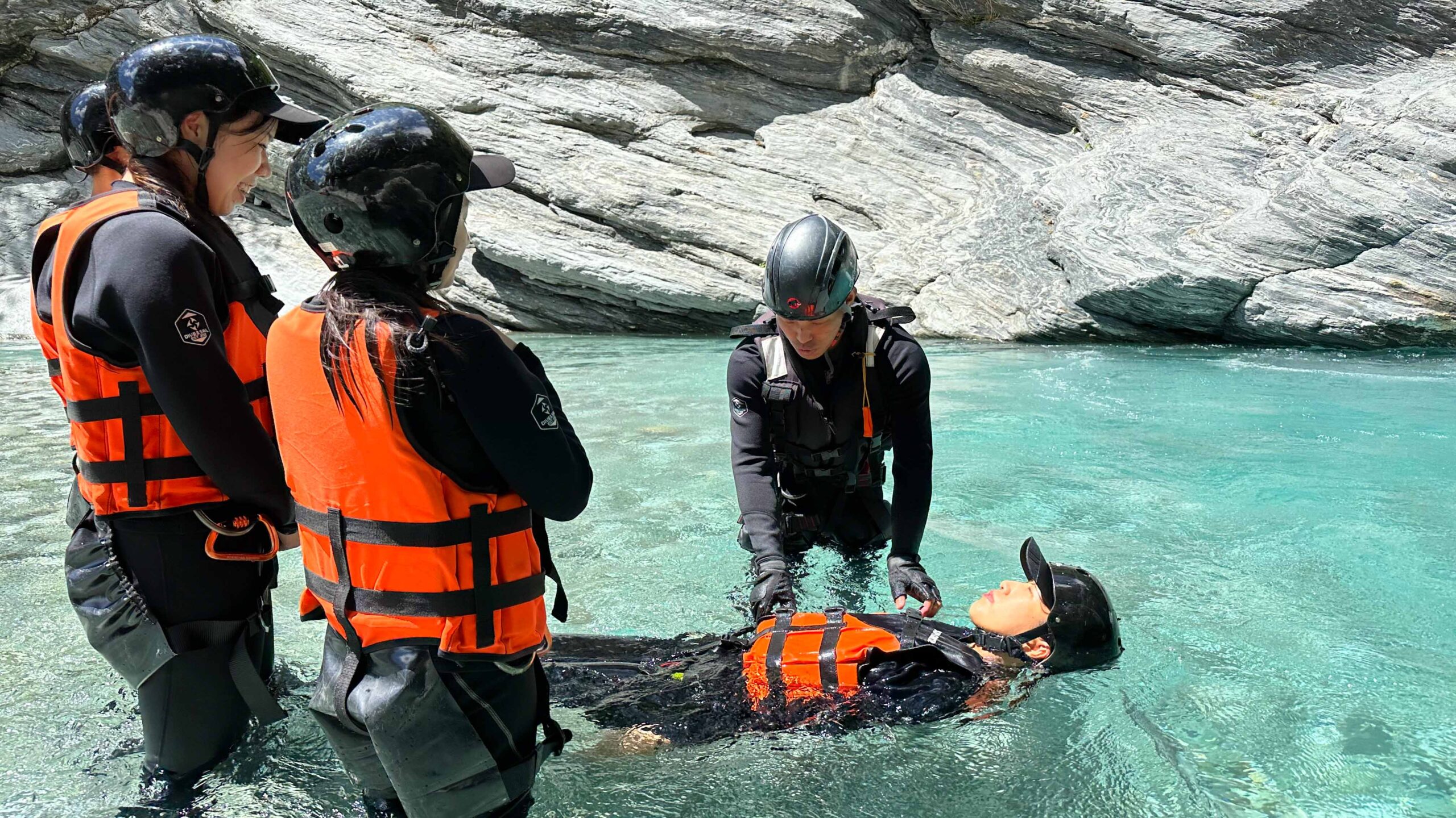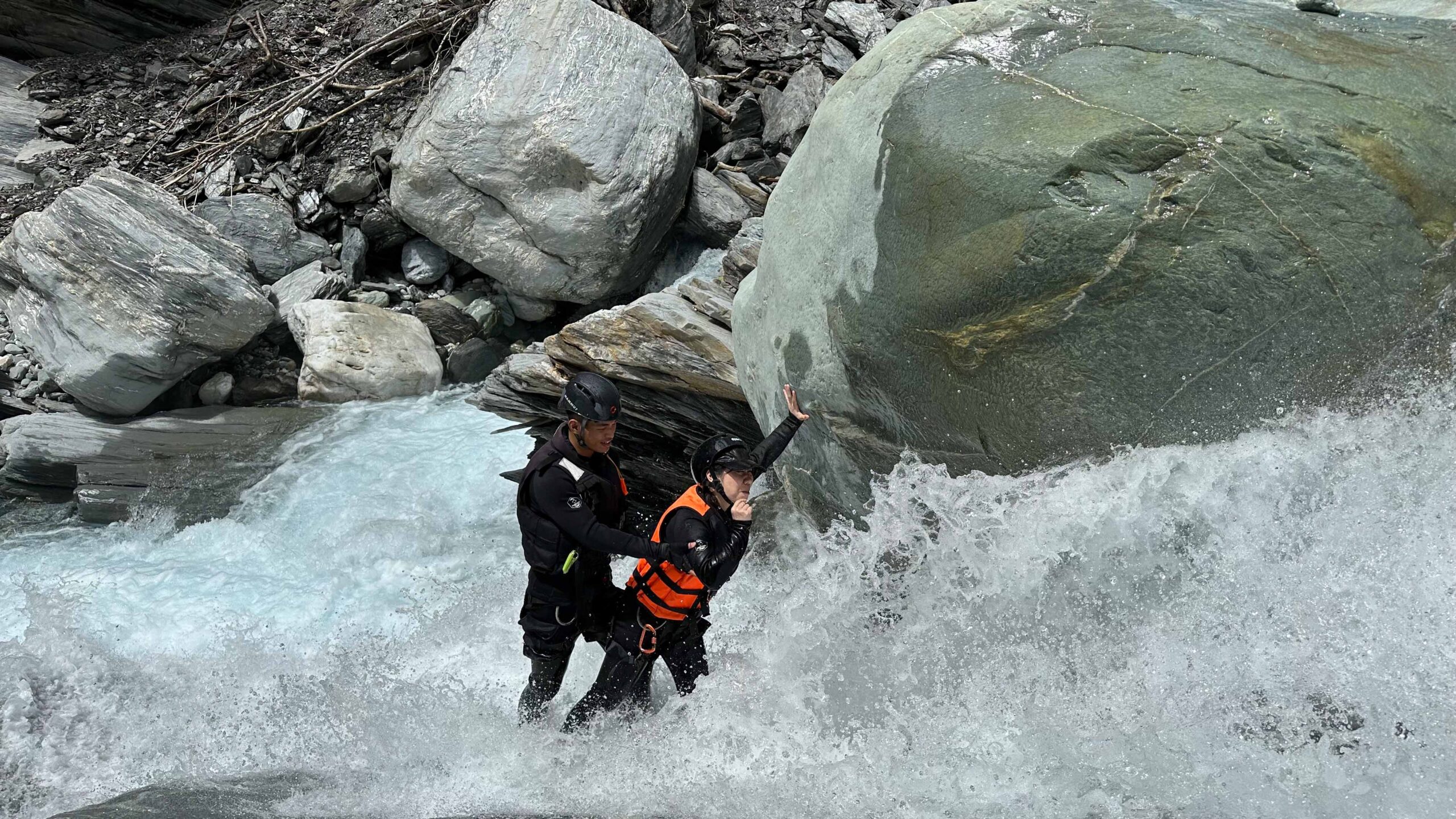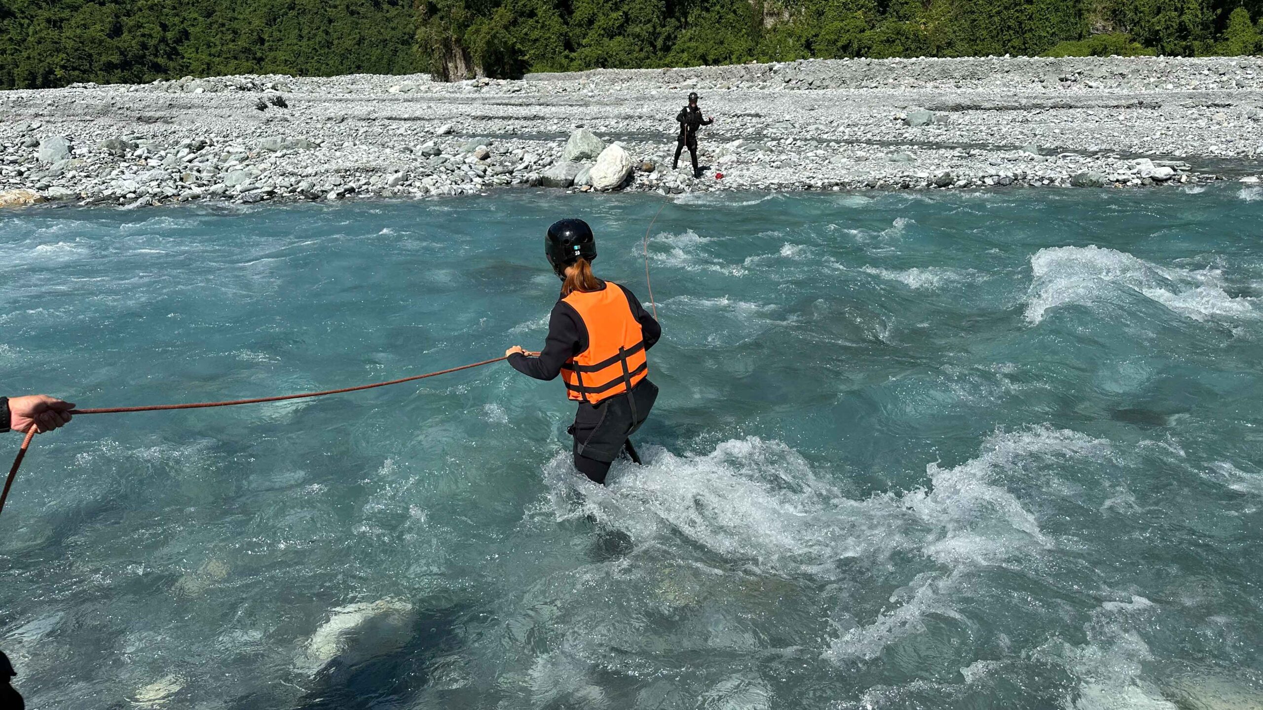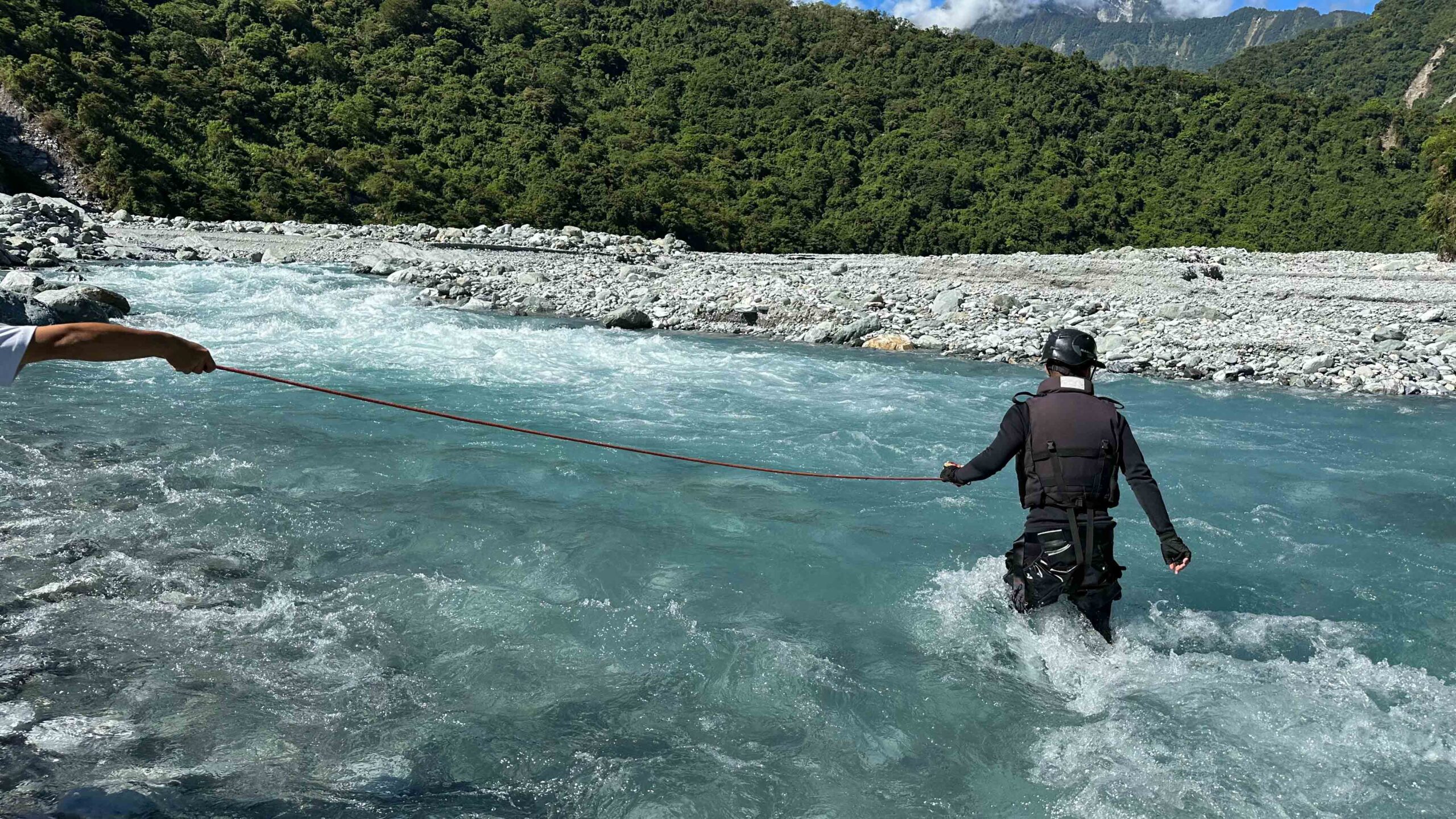 ▲ 阿賢教練讓團員體驗逆流攀繩而上;並教導正確使用救生衣的方式