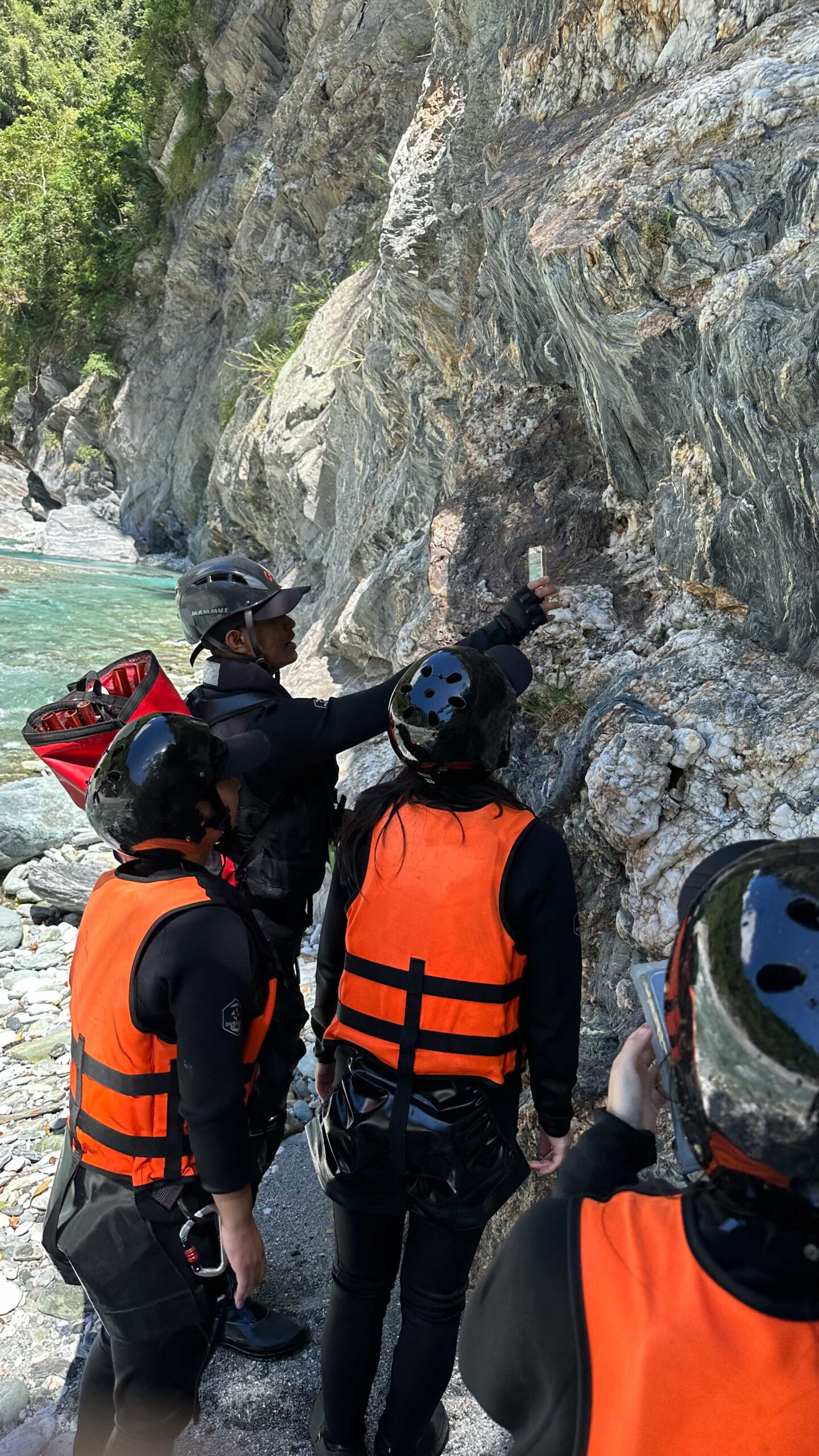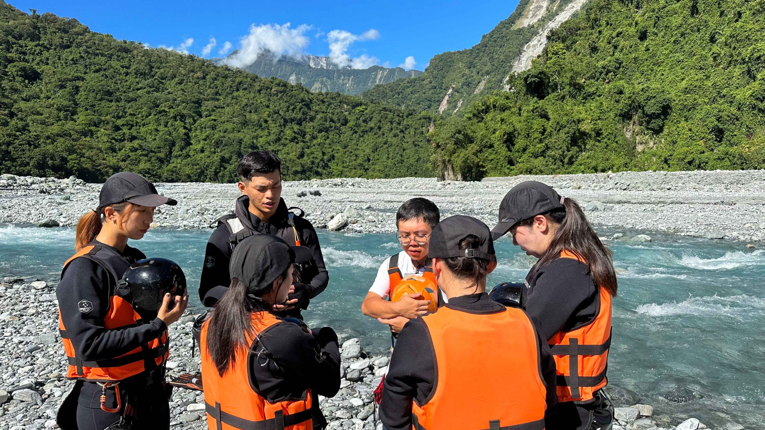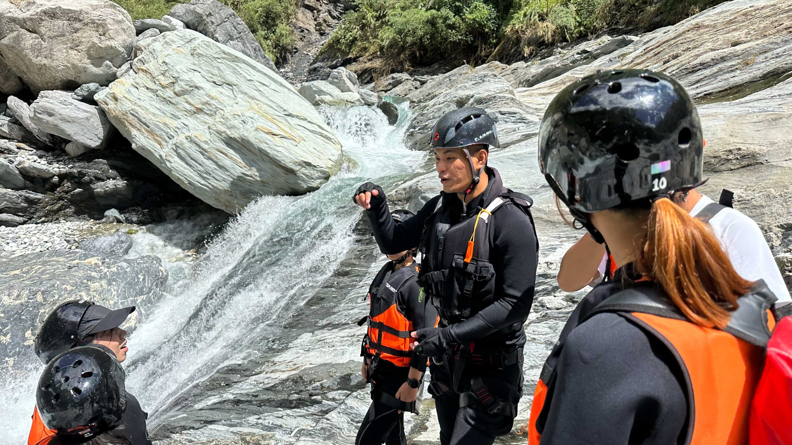 每年颱風季節,台灣東部總是首當其衝,在經過颱風侵襲、淘洗過後,河床溪谷的樣貌也會大有不同,今日我們將跟著阿賢教練的腳步,從清昌溪溯溪而上,探訪水晶谷秘境。在著裝的同時,教練會要求團員們互相檢查,一方面確認裝備是否正確使用,另一方面則是培養彼此夥伴的認知,也讓團員間產生無形的羈絆,更具凝聚力。