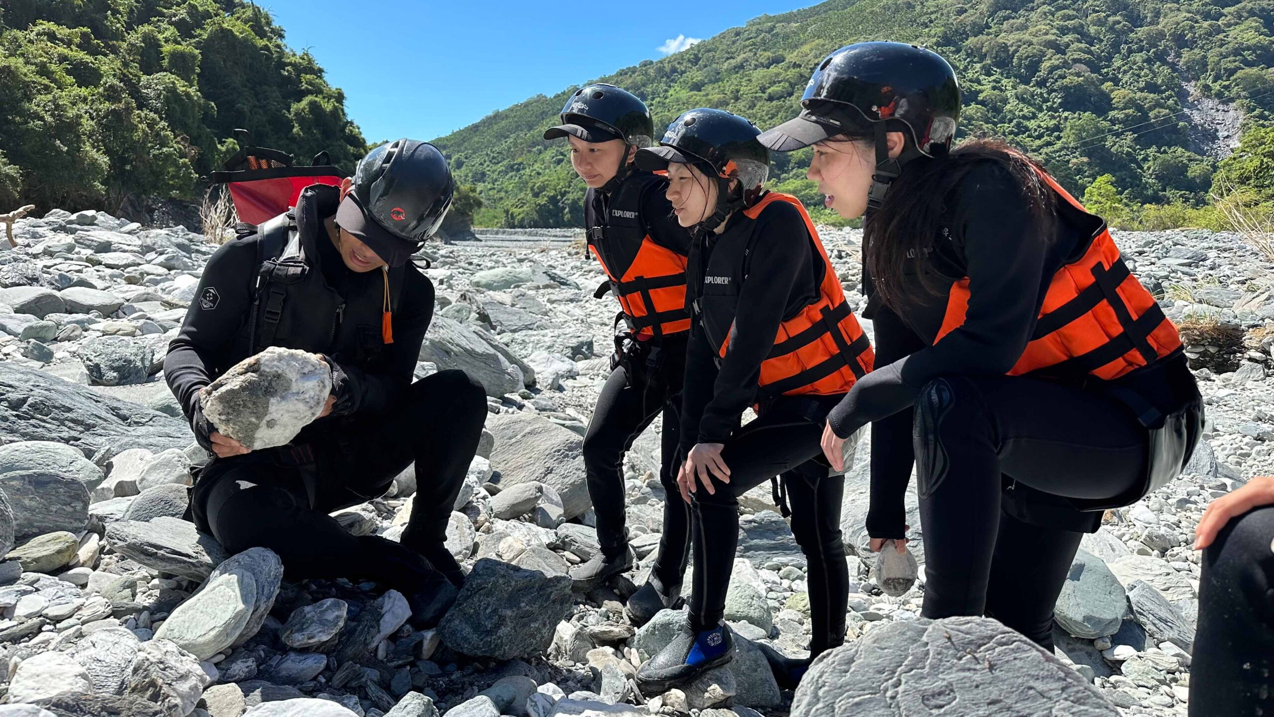 ▲ 阿賢教練帶領我們爬過攔砂壩;阿賢教練發現水晶結晶,團員爭相目睹