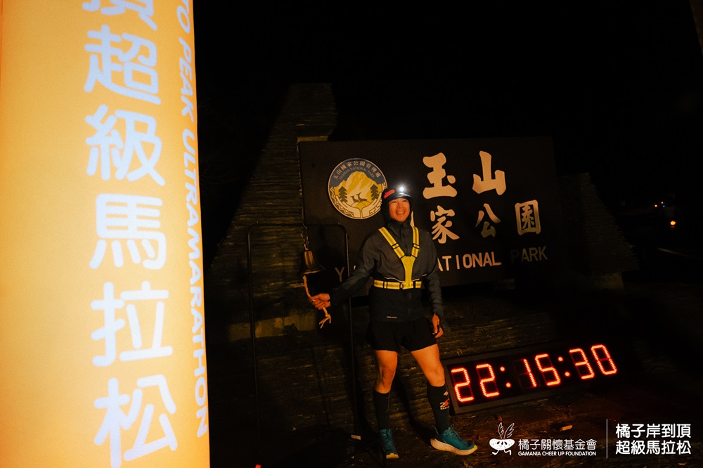 ▲李俊昌選手於178公里的「自我挑戰組」終點-玉山國家公園界碑敲鐘,以22小時15分鐘29秒的成績,成為本次賽事總冠軍以及唯一成功挑戰完整賽道的跑者。