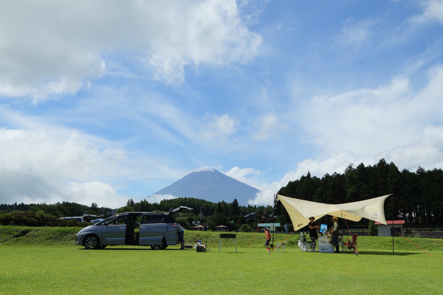 同樣位在朝霧高原的 Fumotoppara 露營區,彷彿沒有邊際的草原,開闊感十足,露營地隨處都能看到富士山!營區採線上預訂制,一樣是免費的營地,再加上是廣為人知的 GO OUT CAMP 的御用場地!早上 8:30 就開始辦理入住,建議提早入場喔!
