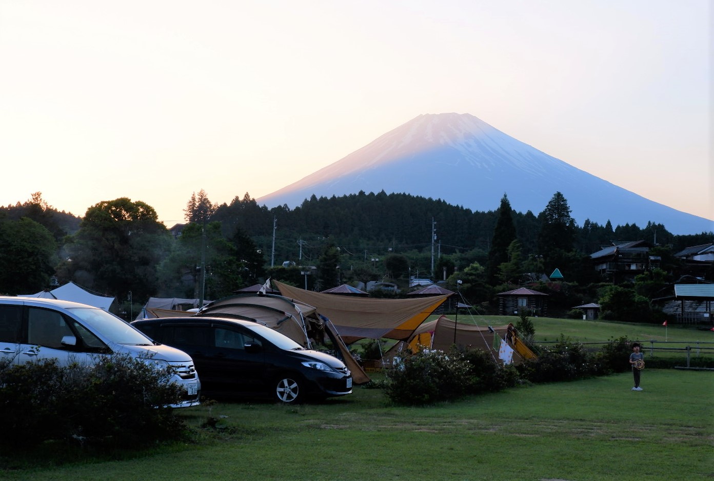 位於富士山腳下的小野寺家庭露營地,面積達 35,000 平方公尺,比兩個東京巨蛋還大。擁有寬闊的草地,除了旺季外,不會特別劃分車格,是免費的汽車露營地,也適合想要搭大帳篷的露營玩家。此外,還有由神木製成的露天浴池,讓你能邊泡湯邊欣賞富士山的壯麗美景。