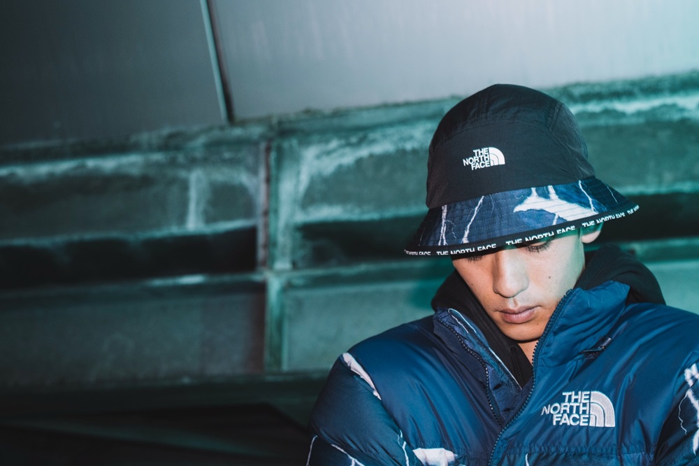 女生版本的2000 RETRO NUPTSE 羽絨服同樣具有男士同款的高機能,並以最流行的 Y2K 弧形線條勾勒肩膀輪廓,展示女性都市遊人的隨性前衛。同款閃電印花漁夫帽也以 DWR 防潑水處理,讓穿著者更自在穿行都市街道之間。