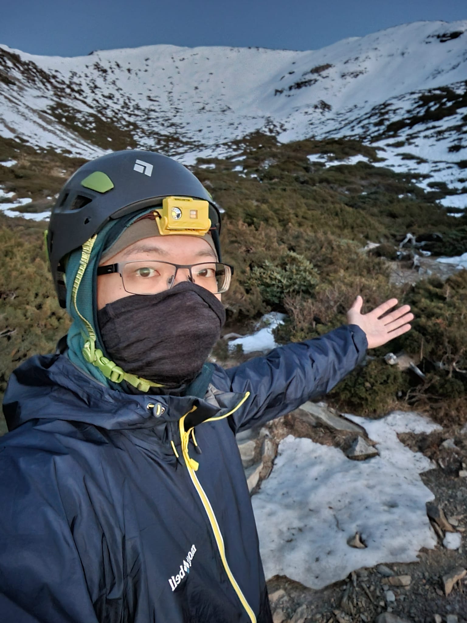 2022 年初,他看到新聞報導雪山因為降雪白了頭,那如夢似幻的雪景,讓他心生嚮往。「我看了兩個月的各種新聞、社群分享,實在是心癢難耐,於是自己做功課,查了一下該怎麼搭車去登山口,以及登雪山的路線,還有雪季登山需要的裝備等等。」在此之前,小白只有爬過合歡北西,也曾挑戰過陽明山東西大縱走,取得了不錯的成績 (7 小時 56 分),但雪季登山對他來說無疑是一大挑戰。他笑了笑說:「我知道有一定難度,但我實在是太想去拍雪景了。」