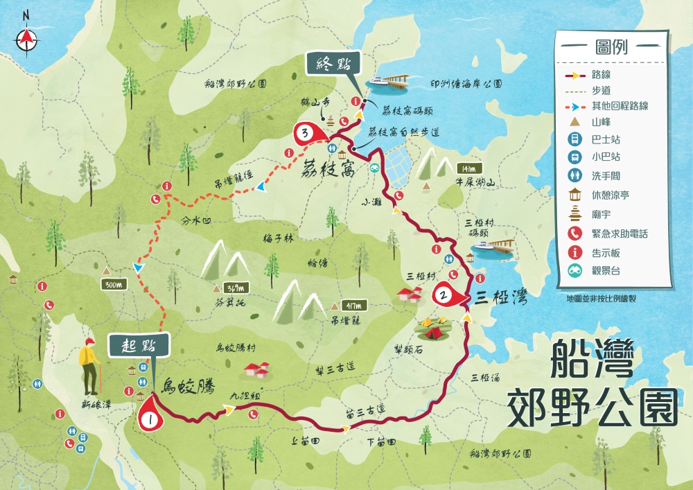 最後一個要推薦給大家的路線,就是船灣郊野公園。這個公園有著 400 多年歷史的客家聚落,同時還有百年歷史的人工「風水林」,更有豐富的野生動物。如果想輕鬆走,可以從新娘潭往北走到荔枝窩。光是新娘潭就有許多自然風光可以欣賞,像是新娘潭瀑布和照鏡潭瀑布,都十分優美,推薦駐足停留一下。但實際上較多人會走的路徑是從新娘潭往東南,走到三椏灣,再到荔枝窩。在這條路線上,可以看到戰時被村民拯救的「五指樟」,以及樹齡過百的「空心樹王」。回程時可以走環狀方式回到起點。