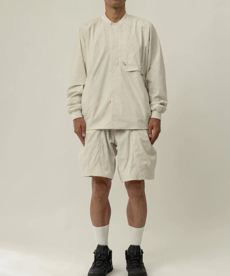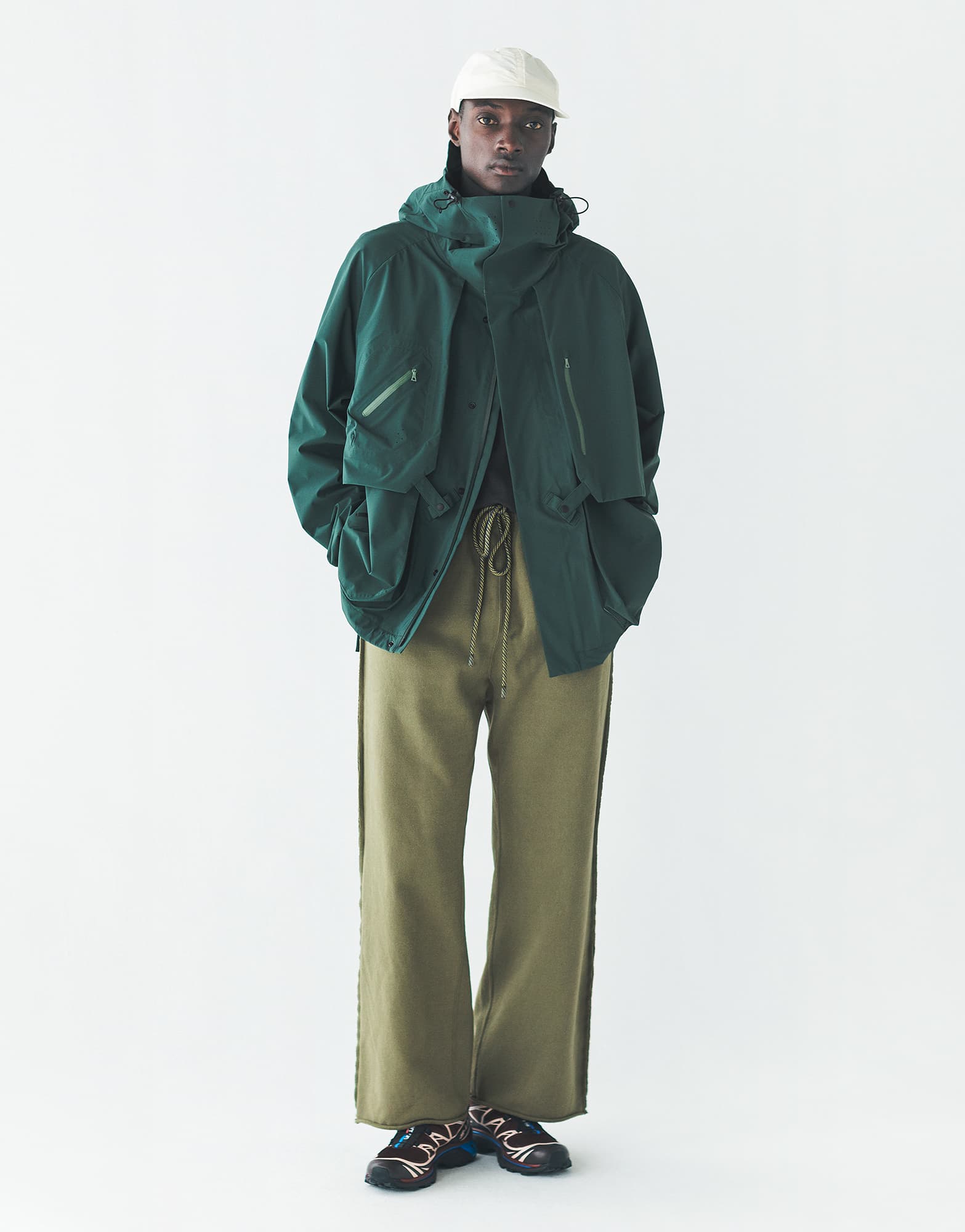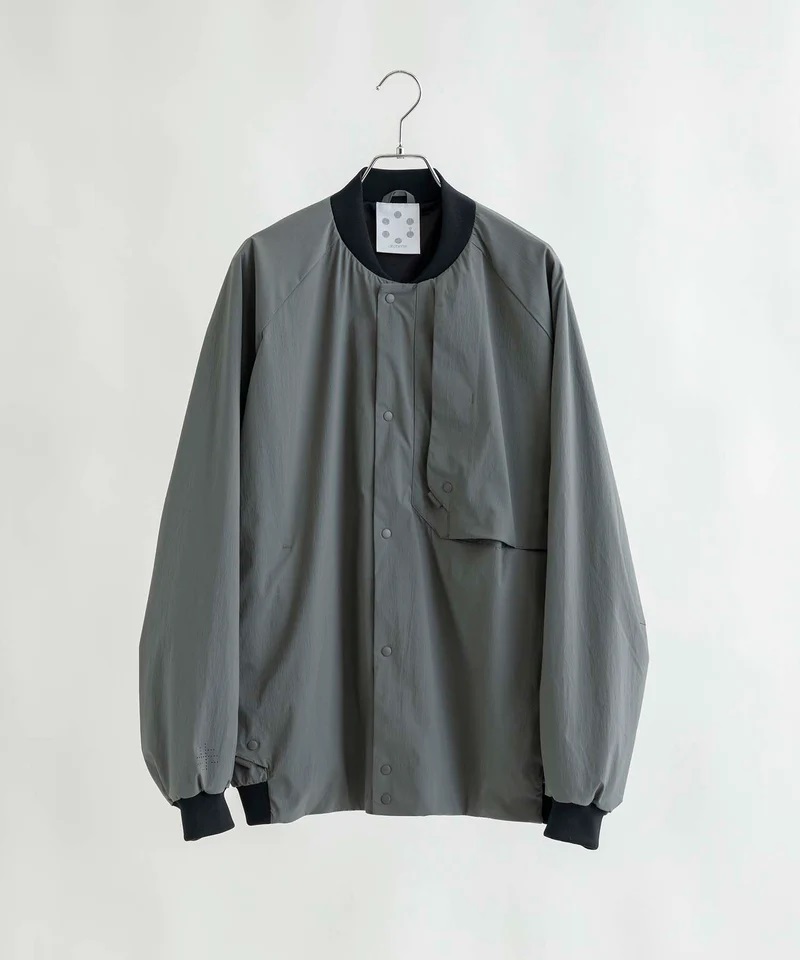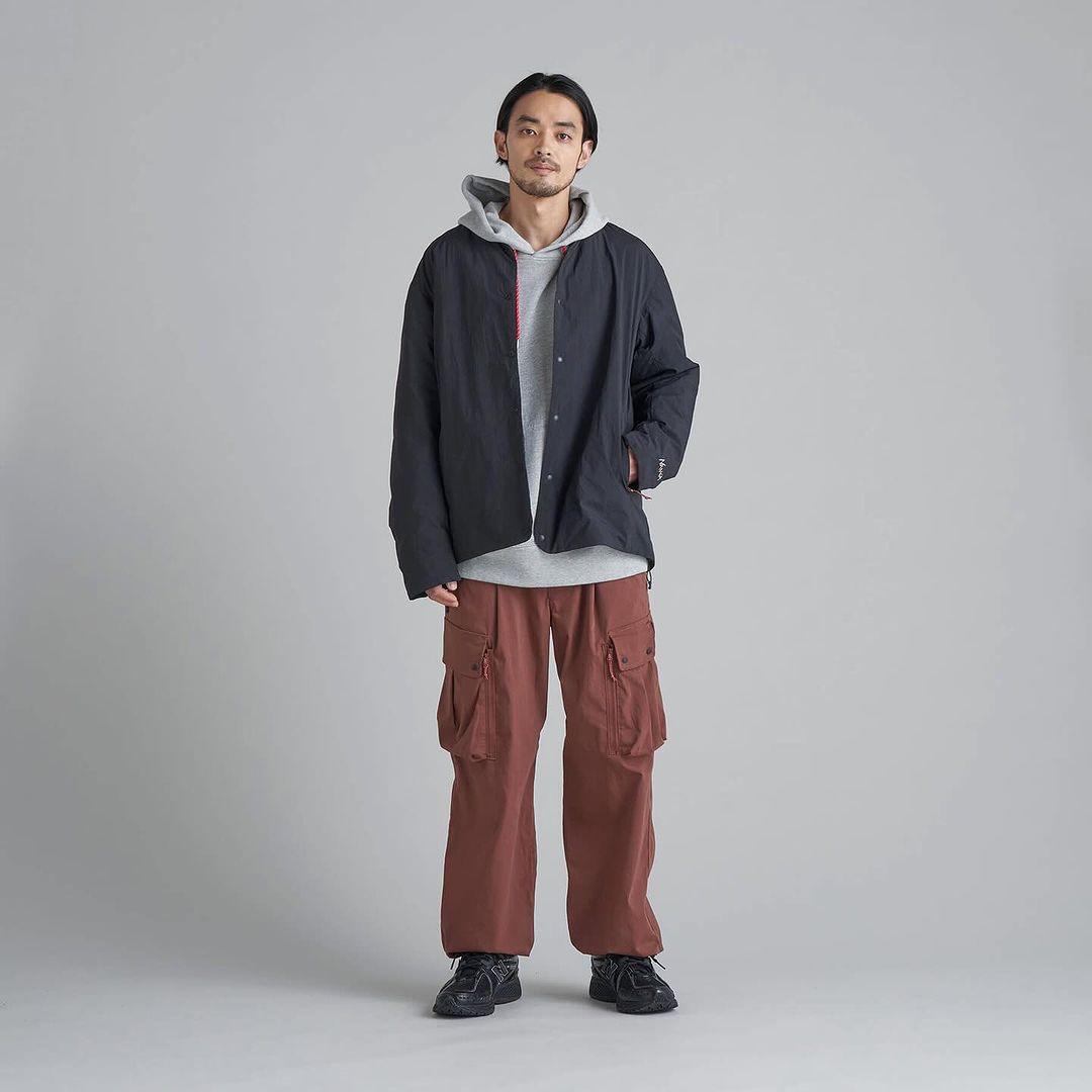 外套材質使用新開發的尼龍防水材料 Karu stretch Ⅱ,重量輕且具有高伸縮性 布料,表面經過C6耐久防水處理,可達到良好的防水效果,且具有抗皺功能並富有彈性,穿著舒適,版型較為寬鬆,可以在內裡混搭T-Shirt、襯衫、帽T等,造型多變。
