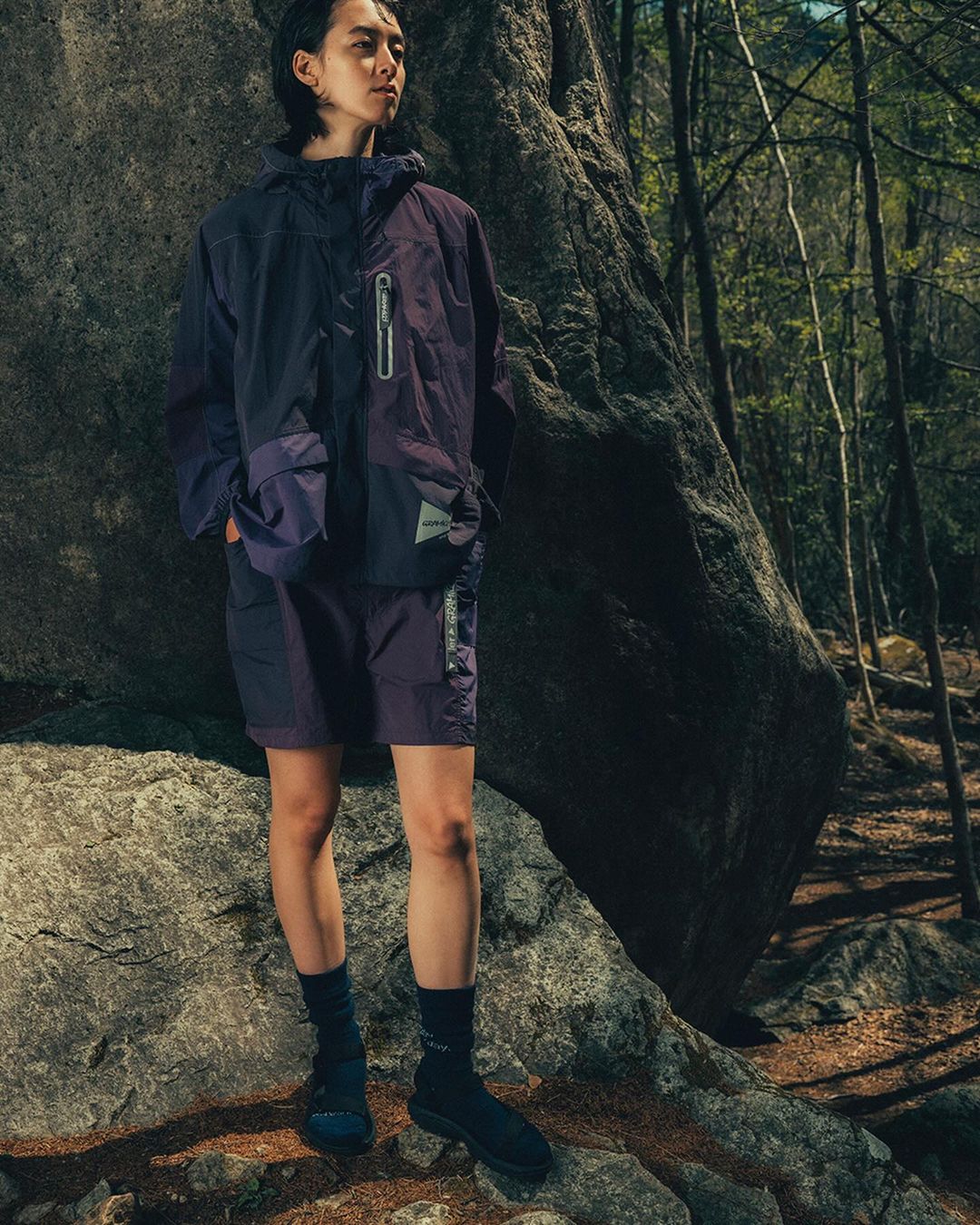 聯名系列其中一款防水外套,使用 High Density Nylon 面料,是一種由輕質 40D 尼龍密織而成的材料,給人一種薄而適度堅固的感覺。外套部分區域採用反光縫線,以提高夜間可見度。