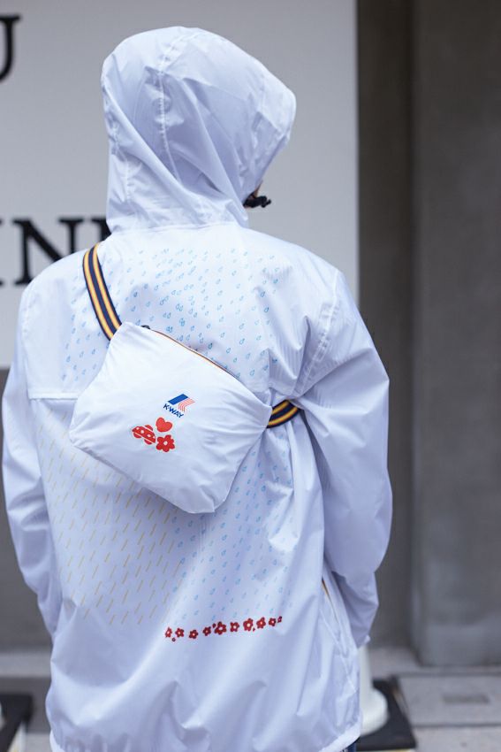 以 K-WAY 經典 Le Vrai 系列作為模板,防潑水輕量風衣,背部有透氣通風開口,適合微涼天氣。可摺疊收納於有拉鍊的口袋。口袋附有鬆緊織帶,可將收納後的風衣繫於腰間或上肩,兼具實用與獨特性,方便攜帶以備不時之需,用不到時也可作為穿搭裝飾。BRU NA BOINNE 以「雨後花開」為概念,以手繪圖騰的形式展現在外套背後及胸前 Logo。不僅可以在雨天穿著,還可以在街上和戶外穿著。