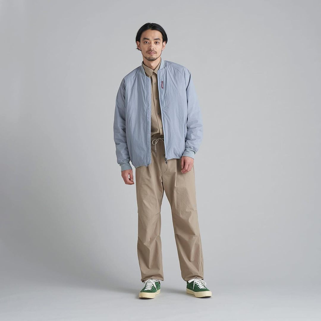 Soft Down Varsity Blouson 以運動校園風格夾克為形象參考設計而成的 Blouson 外套,羽絨填充量調整成適合春天穿著的厚度,呈現出相較於冬季羽絨外套更輕盈舒適的穿著感,適合作為冬季的中層內搭,春、秋兩季則適合作為外層搭配。也推薦當外套穿著,裡面可搭連帽上衣或高領上衣,版型寬鬆內搭較厚的大學T 或連帽上衣等也不會感到臃腫。表布使用具凹凸手感且比一般的尼龍布料觸感更加柔軟、舒適的水洗質感加工撥水尼龍布料,下擺使用滑順的針織布料,使親膚與合身感再提升。