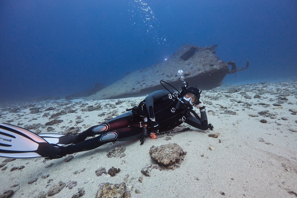 Sunny:平時拍戲或是錄製節目的時候,我們有狀況可以隨時和其他演員與導演討論,但在水下,就算已經事先安排許多細節,實際下潛時還是無法控制的突發狀況,要在水中排解問題,也是需要更仰賴與團隊之間的默契。另外,原本我是學自由潛水,為了節目去考取 AOW 證照(進階開放水域潛水員),才開始不同潛水技術的訓練,休閒潛水頂多到水下二、三十米,但沈船位置通常深至四時至五十米,危險度也提升,我大概都維持在四十米的深度,超過四十米的地方就交由白叔去拍攝。