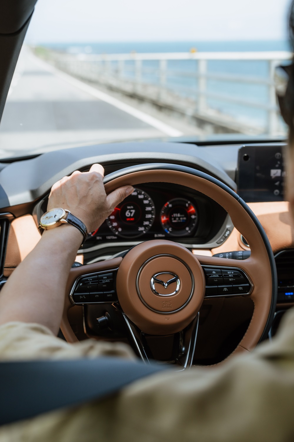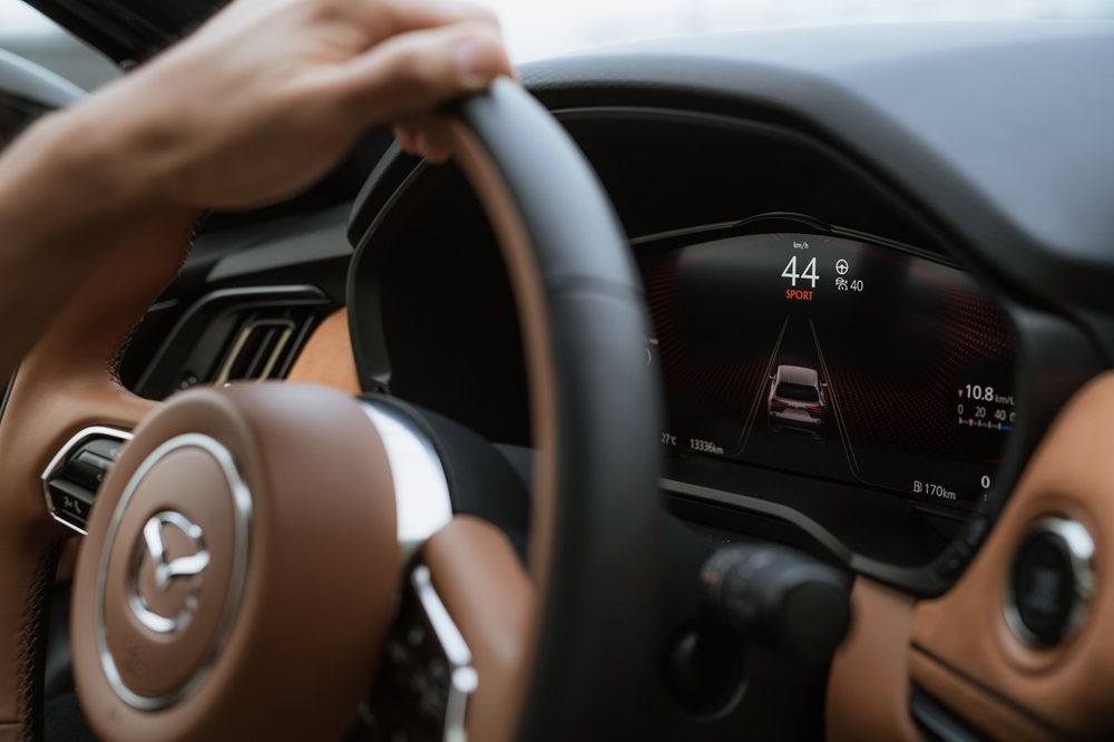 「CX-60 33T 在渦輪增壓與輕油電助益,有著更輕巧的加速表現,而油門只要稍微加深,就能感受厚實力道與六缸的低沉聲浪。剛剛也有嘗試調至 Sport 模式,除儀表轉為紅色視覺營造賽車感,也感受到渦輪增壓特性,引擎輸出與變速箱也變得更有力,跟第一眼看到他看似魁武的外觀有著反差的表現。」習慣開老車的 Owen,這次體驗到了新車,更是有了強烈對比,無論新舊世代,都不減他對汽車的駕馭樂趣。
