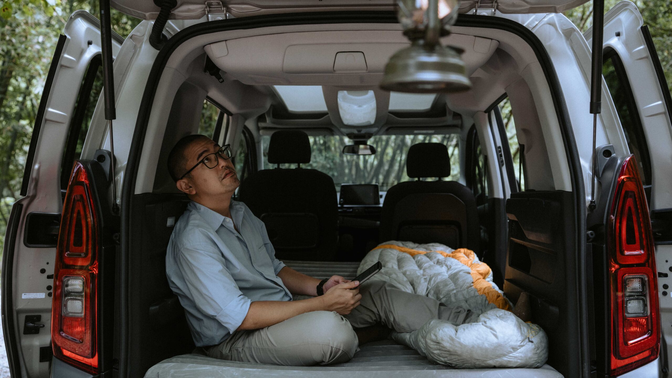 Vincent 將後座全傾倒並鋪上了露營睡墊,與我們分享他駕馭長短軸 BERLINGO 的心得:「我必須坦白說我不是那種想要表現得像個專業人士,事實上我更傾向以使用者的角度單純分享,車輛是不是真的可以貼近我們的生活,去感受他們有趣之處,所以才會一直用比較淺顯易懂的方式,找到觀眾與內容間的共感,與其用很產品面向的角度去解釋分析汽車,我更像是一個說書人吧我想。」
