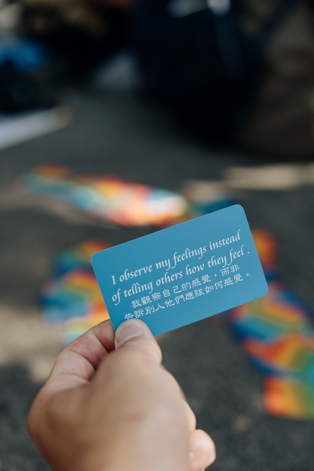 ▲還準備了彩虹卡給大家,在腦中冥想你想瞭解的問題,接著抽出一張牌,牌卡上面的文字,通常自然反映出你當下關心的問題,你的心情和需要,提供正向的解答,看到文字的那瞬間,似乎也賦予這趟山行更深一層意義。