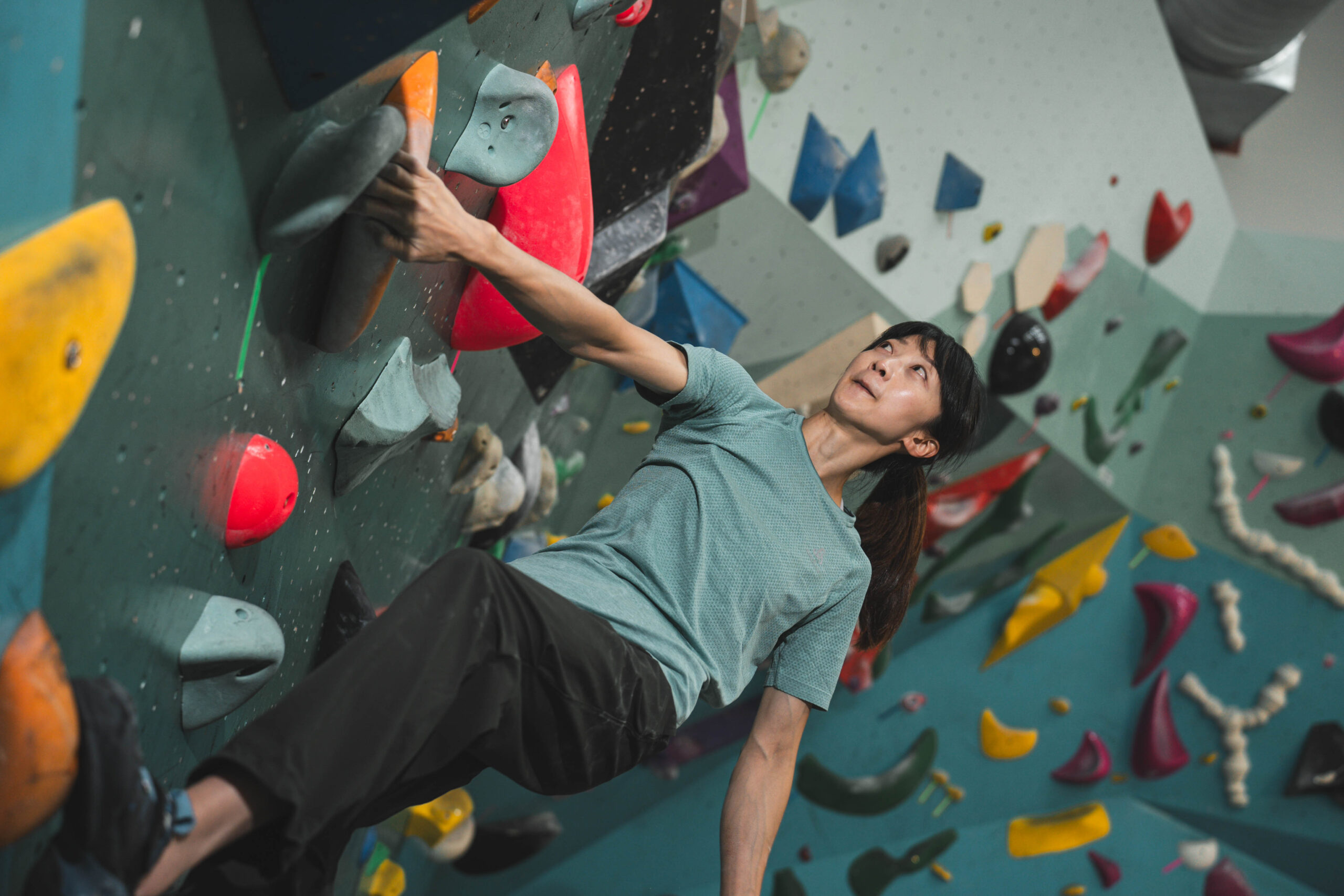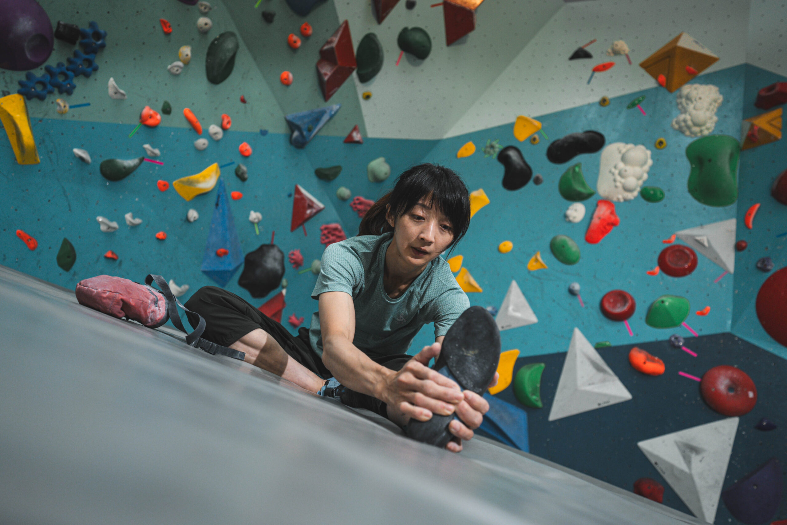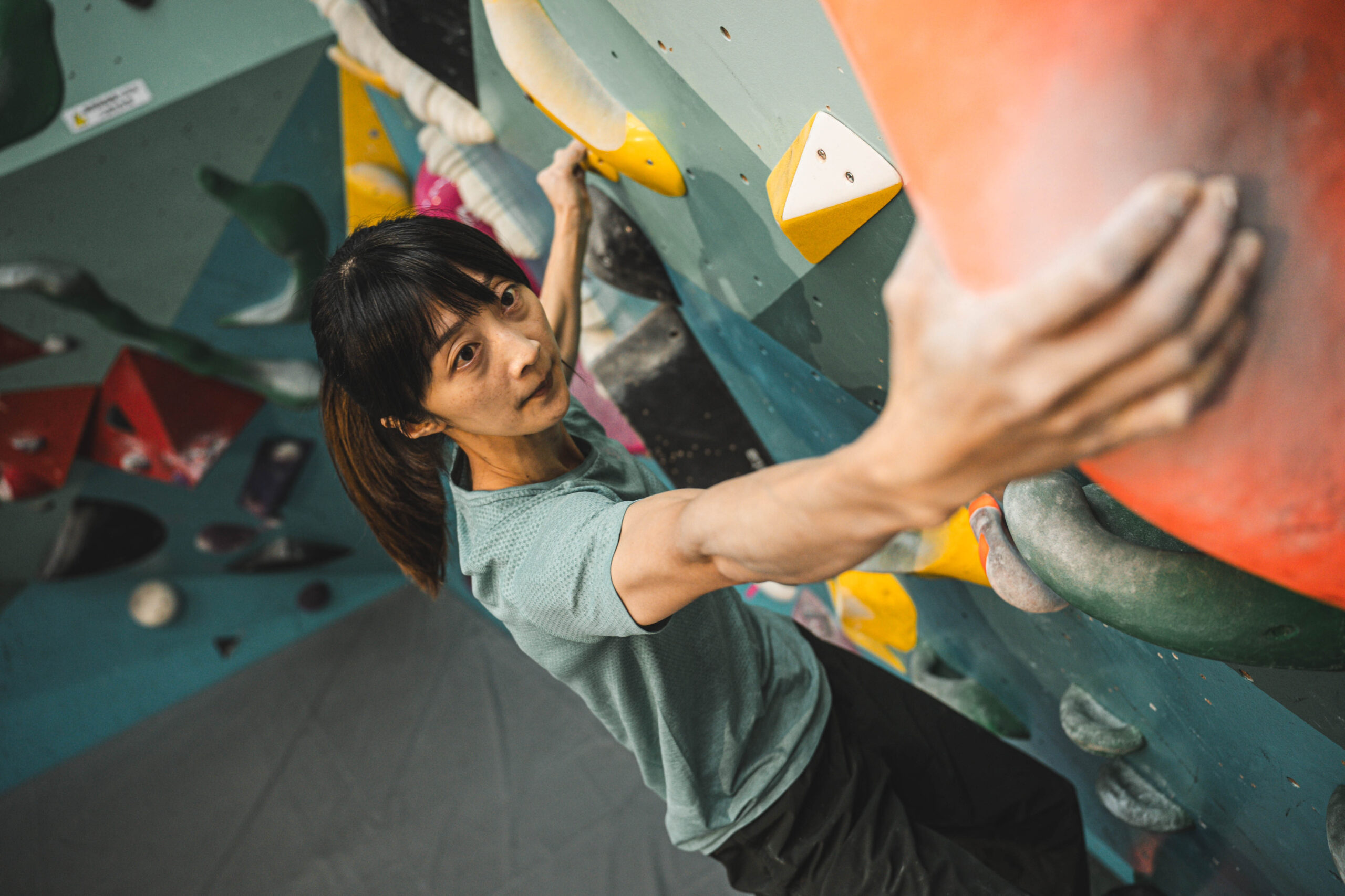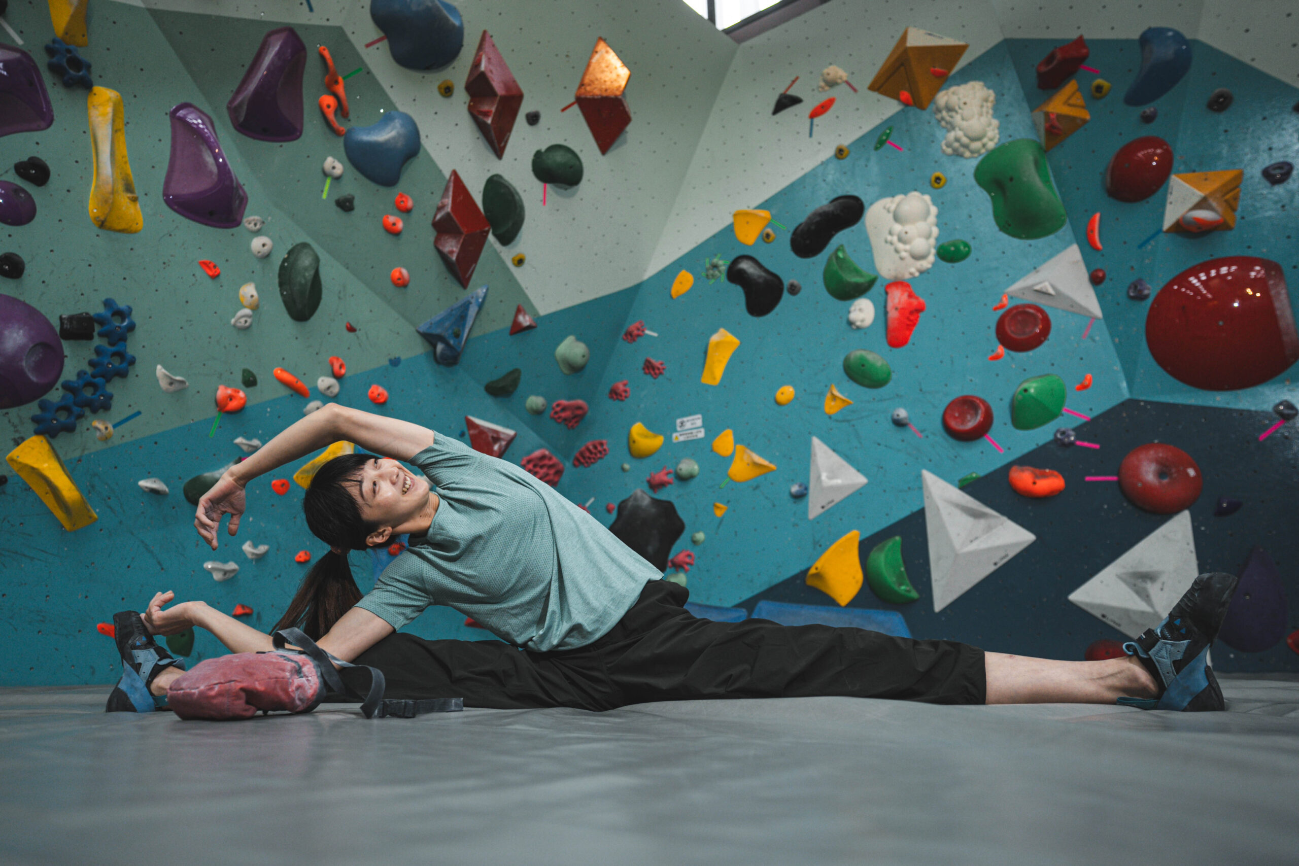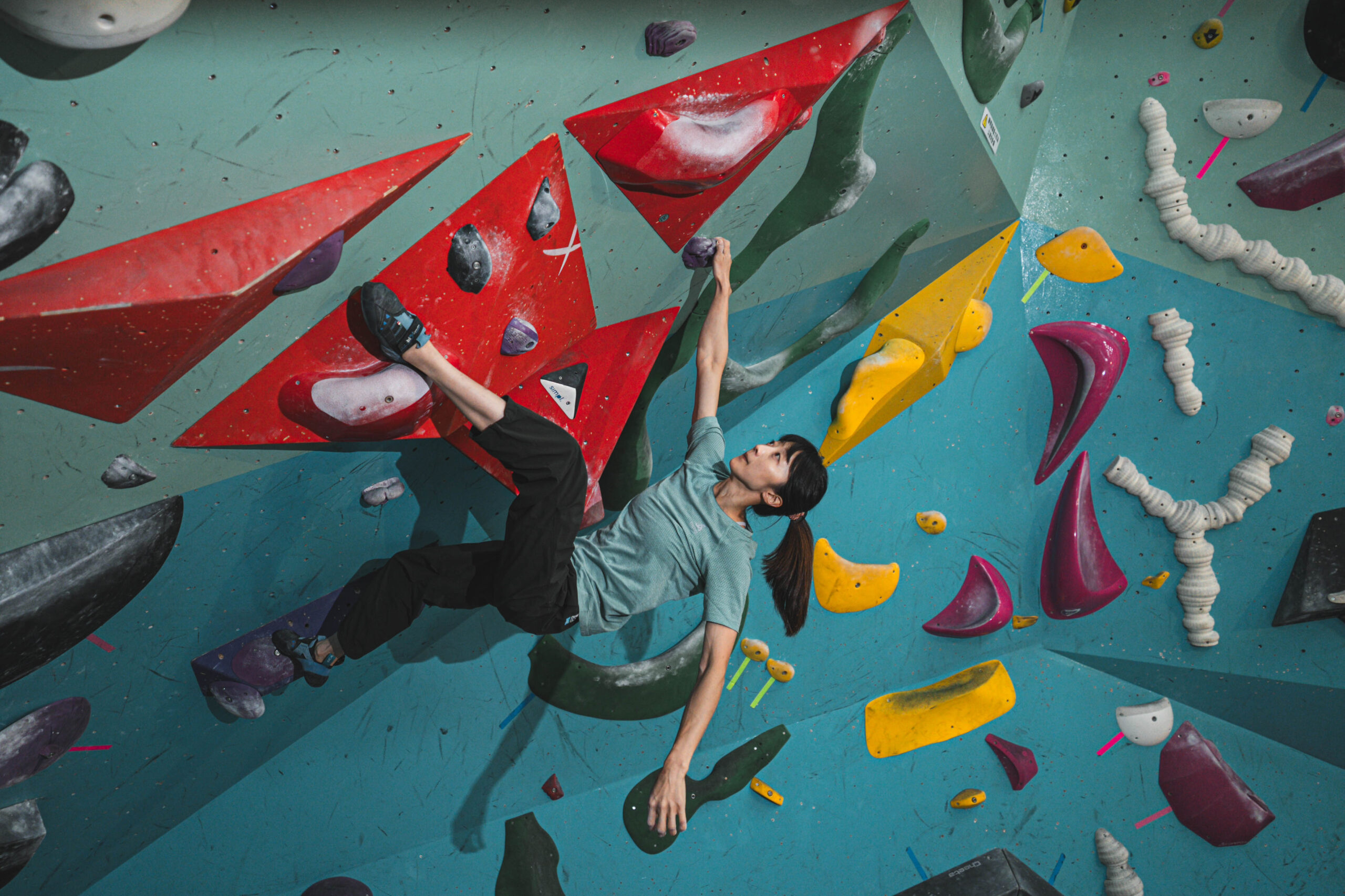 我們接著轉往虹瑩的主戰場室內岩館,虹瑩正在暖身,而我們聊起 2020 年日本東京終於將運動攀登列為競賽項目之一,卻又遭逢百年大疫不得不延期一年舉行,這對運動員來說是巨大打擊,雖然表面上只是延期一年,但實際上對於訓練計畫和職涯規劃影響甚大,這段時間的挫折感難以形容:「正是對攀岩的熱愛和對訓練過程的享受,讓我能夠在逆境中堅持下來,持續提升自己。」