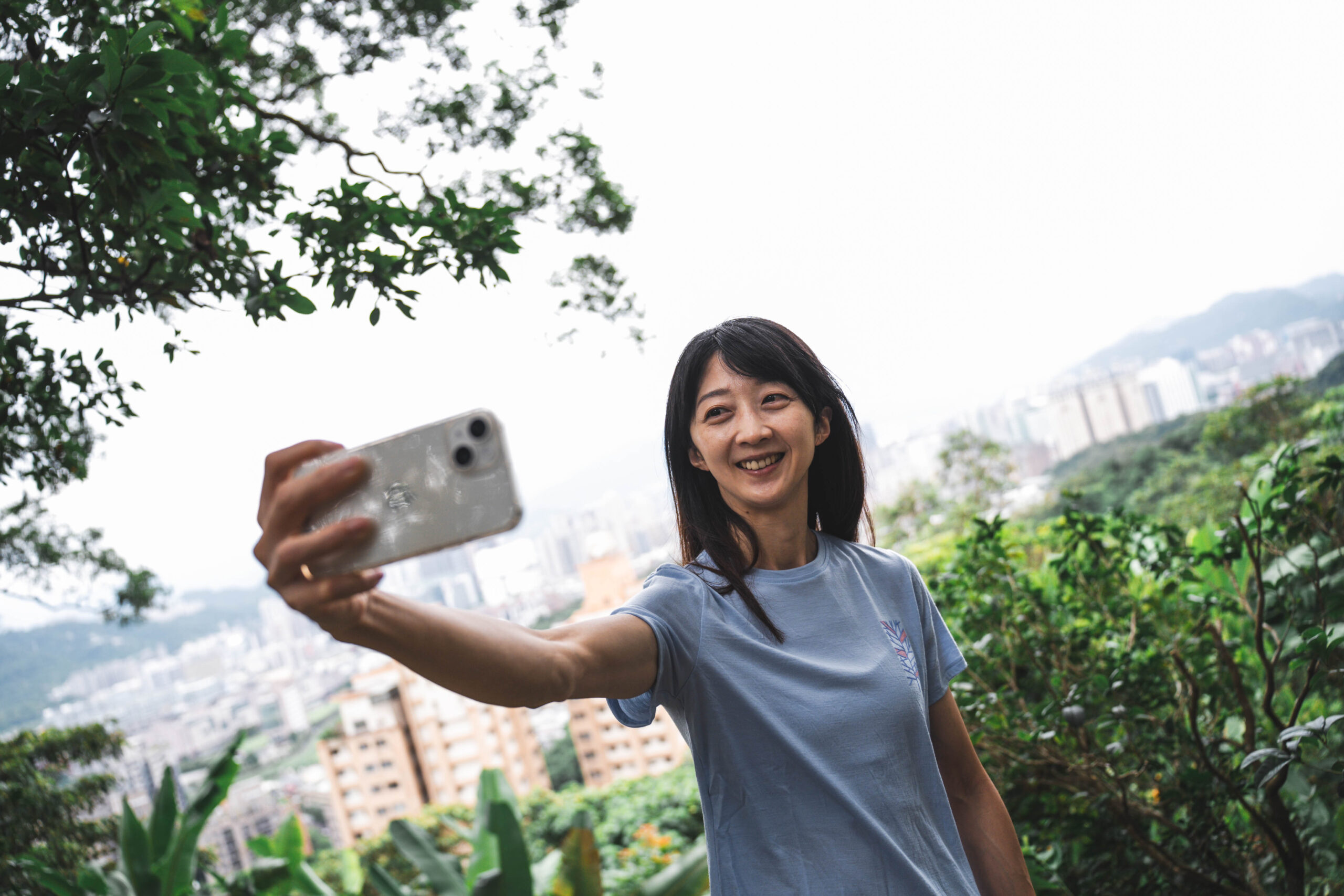 ▲ 登頂遠眺台北市景,虹瑩身著這款 ASCENT 160 羊毛短袖 T-SHIRT 樹木藍鷺,粉色調性正好適合春夏意象,即便穿著在城市也絲毫無違和感。