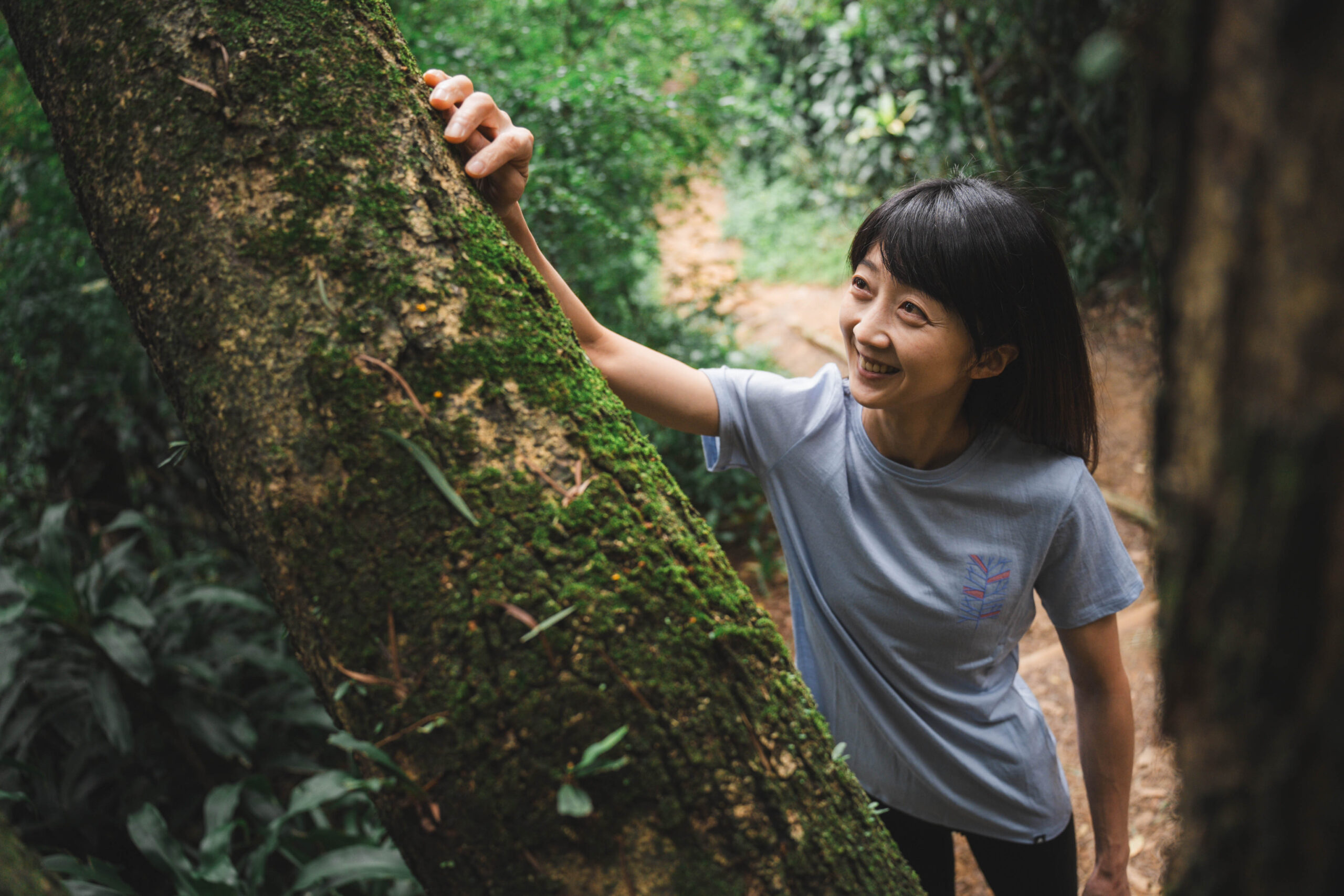這天,我們和虹瑩相約在景美的仙跡岩步道,雖說已經是六月上旬,氣溫卻不如以往悶熱,反倒更有些涼爽,隨著登階量的遞增,映入眼簾的已從都市柏油馬路,轉變成綠意蓊鬱的竹林山徑,只見平時訓練之餘也喜歡到戶外健行的虹瑩邊踏著輕盈步伐邊與我們分享自己是如何踏入職業攀岩選手之路:「2012 年時,我下定決心全職投入攀岩運動,想追求世界級競技殿堂,這不僅是因為我對攀岩的熱愛,還有我想挑戰自己的身體和心理極限。」