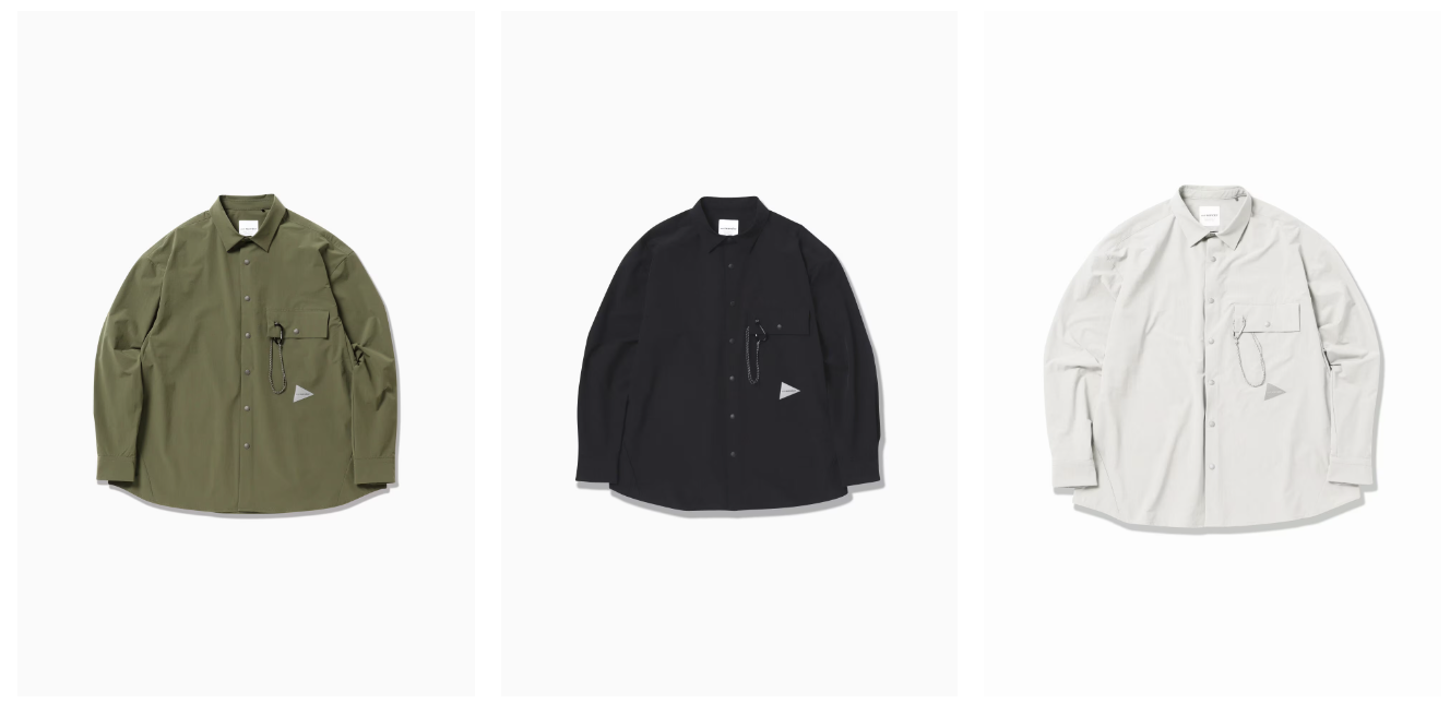 來自日本新潮戶外品牌 and Wander 的 light w cloth shirt,採用塔斯蘭尼龍製成,具有低調的光澤,經過特殊的織造處理,使其表面呈現啞光效果,並且具備四向彈性,這種材料舒適且能快速乾燥,衣服的胸部口袋上還附有一個登山扣,除增添穿搭感外,亦能在需要的情況派上用場。