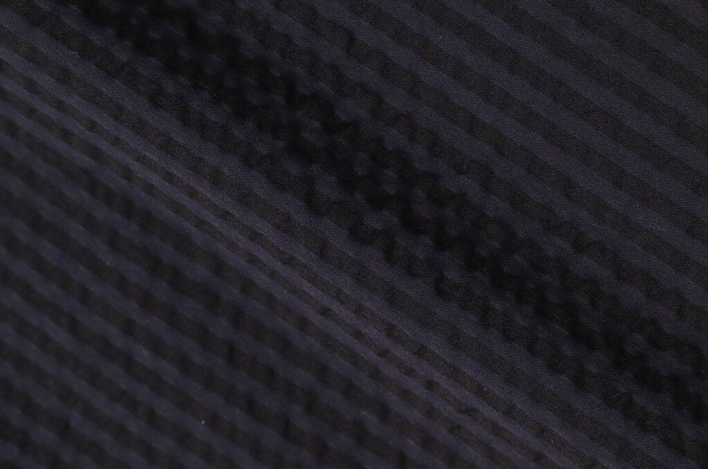 泡泡紗,也稱為「縮織布」,通常用於格紋和其他圖案設計中,這次的襯衫和長褲則獨特地安排了相似顏色的細條紋。顏色是深色調的海軍藍和卡其色,展現俐落形象。