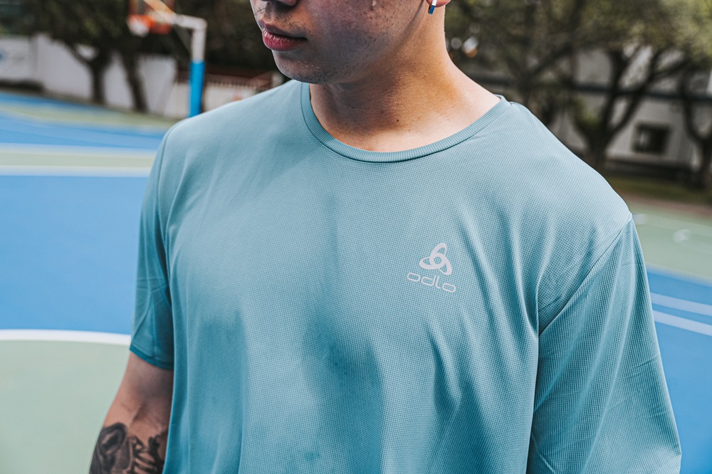 隨著日頭逐漸炎熱,本身容易出汗的王律翔,不過一會兒功夫早已大汗淋漓,「像我們運動量大,衣服一定要選吸濕排汗又快乾的材質,衣服才不會容易黏在身上,很不舒服。今天試穿 Odlo CT T-SHIRT,我覺得就很符合訓練需求,而且有新一代 ZeroScent 銀離子菌抗臭,大量流汗也不會有很濃厚的汗臭味。」