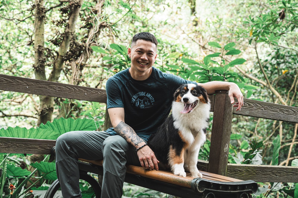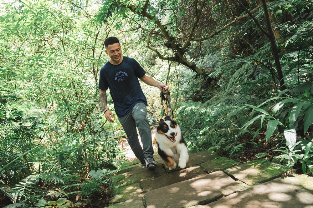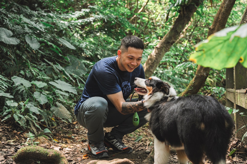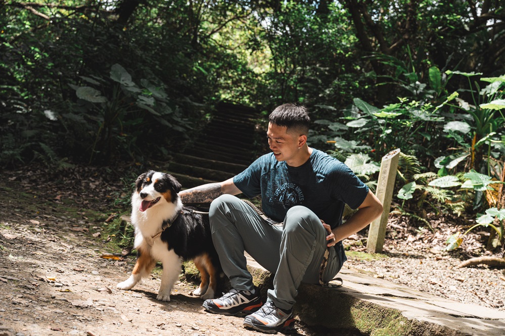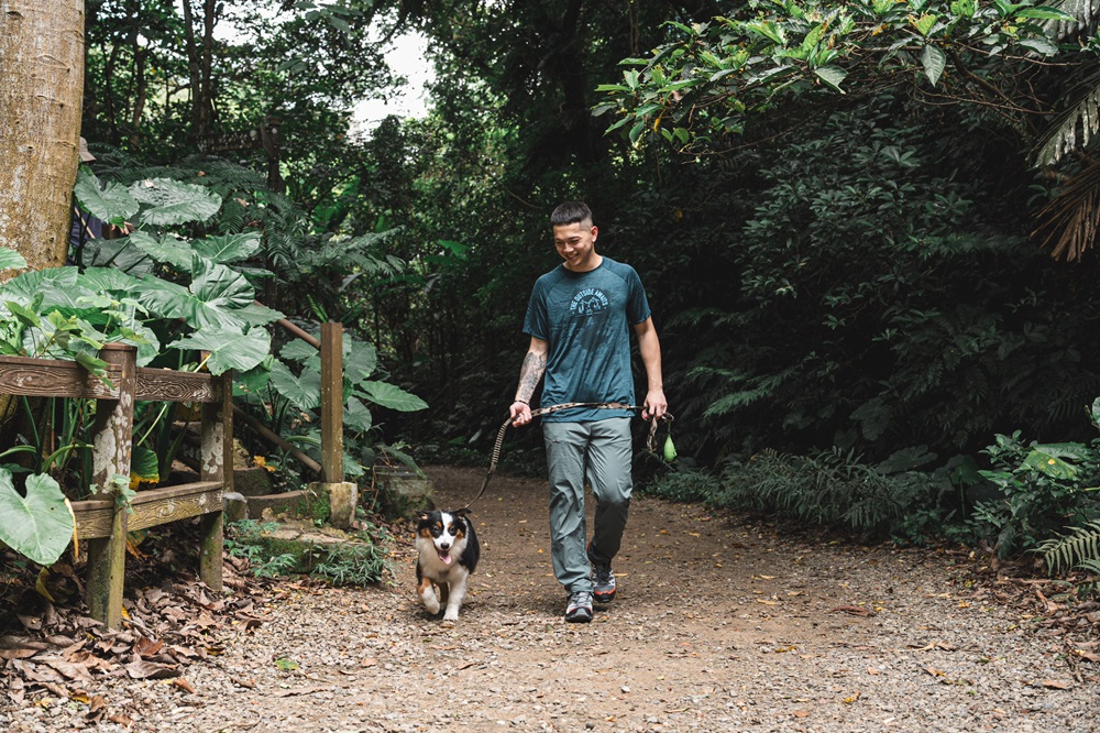 從球場離開,我們轉換到富陽自然生態公園,跟著王律翔一起帶著牧牧,見證他狗生的初次健行體驗。